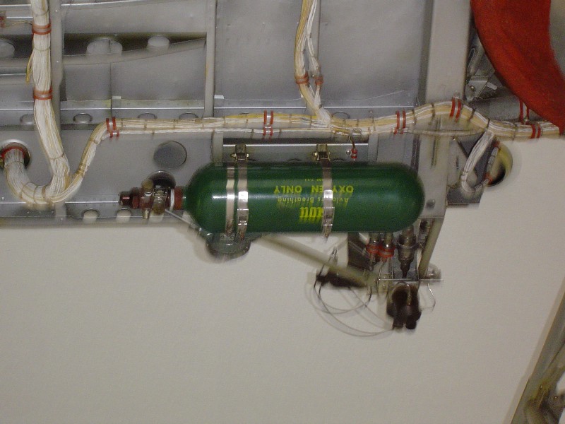 - View of the underside looking aft ( 100k ) showing the engine, the red-collared aft JP4 tank, the lefthand side landing gear, and the grey, spherical hydrogen peroxide tanks on either side of the engine.