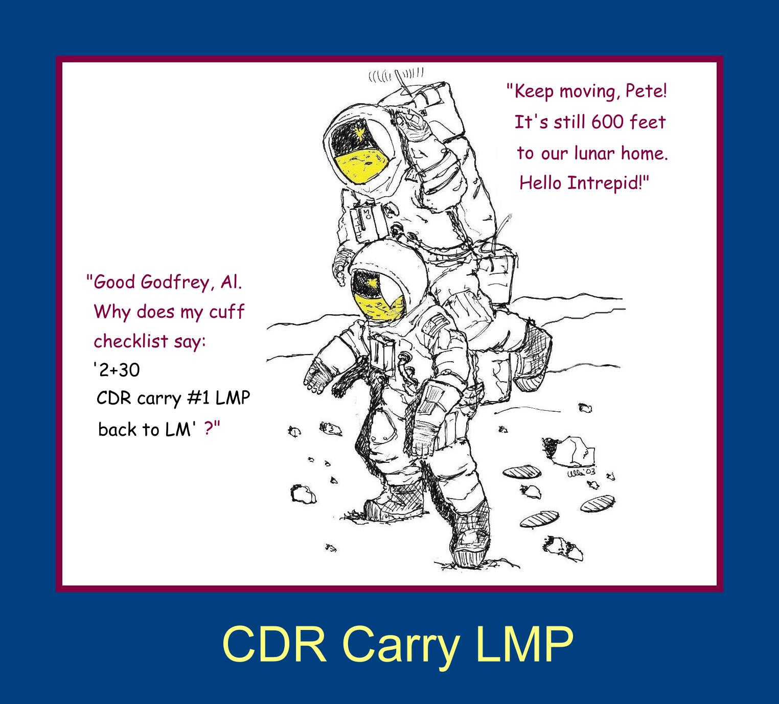 Ulli writes that "this sketch is a tribute to the Back-up and Support crews - especially Ed Gibson - who gave Pete and Al the most interesting of all lunar surface cuff checklists by adding playmate pictures, drawings, and humorous text modifications - 'Albedo' became 'AlBeano' in one instance. Insertion of a line 'CDR carry LMP to LM' would have been the ultimate modification." The real cuff checklist page for the return to the LM at the end of EVA-1 is linked here. |