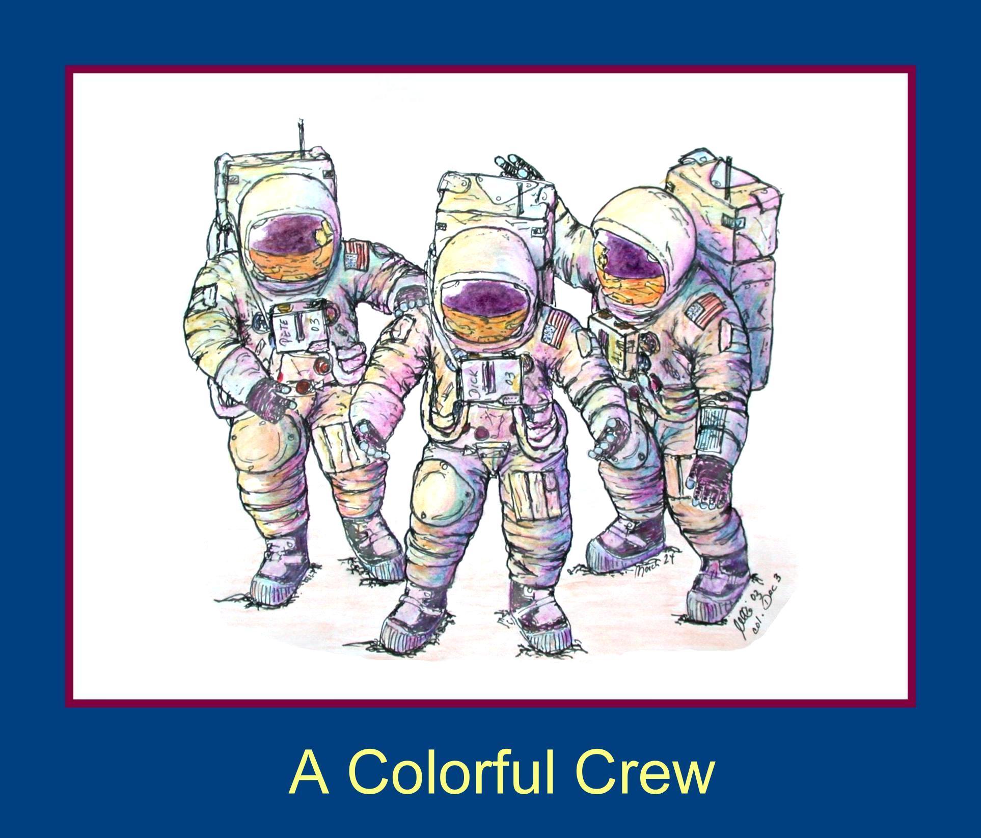 Ulli writes: "Pete Conrad, Dick Gordon and Al Bean - the colorful Prime Crew of Apollo 12 - were all highly-trained Naval Aviators and a very close-knit trio. Three fun-loving boys who are 'friends forever'." "How best to illustrate the spirit of this very special crew? Al Bean has already done it with his great painting Conrad, Gordon and Bean: The Fantasy, so I used Al's motif - sorry Al - and drew Pete, Dick and Al together on the lunar surface, only from a different point-of-view. I've left out Pete and Al's chest-mounted Hasselblad cameras so that I could mark their first names on their RCUs." |