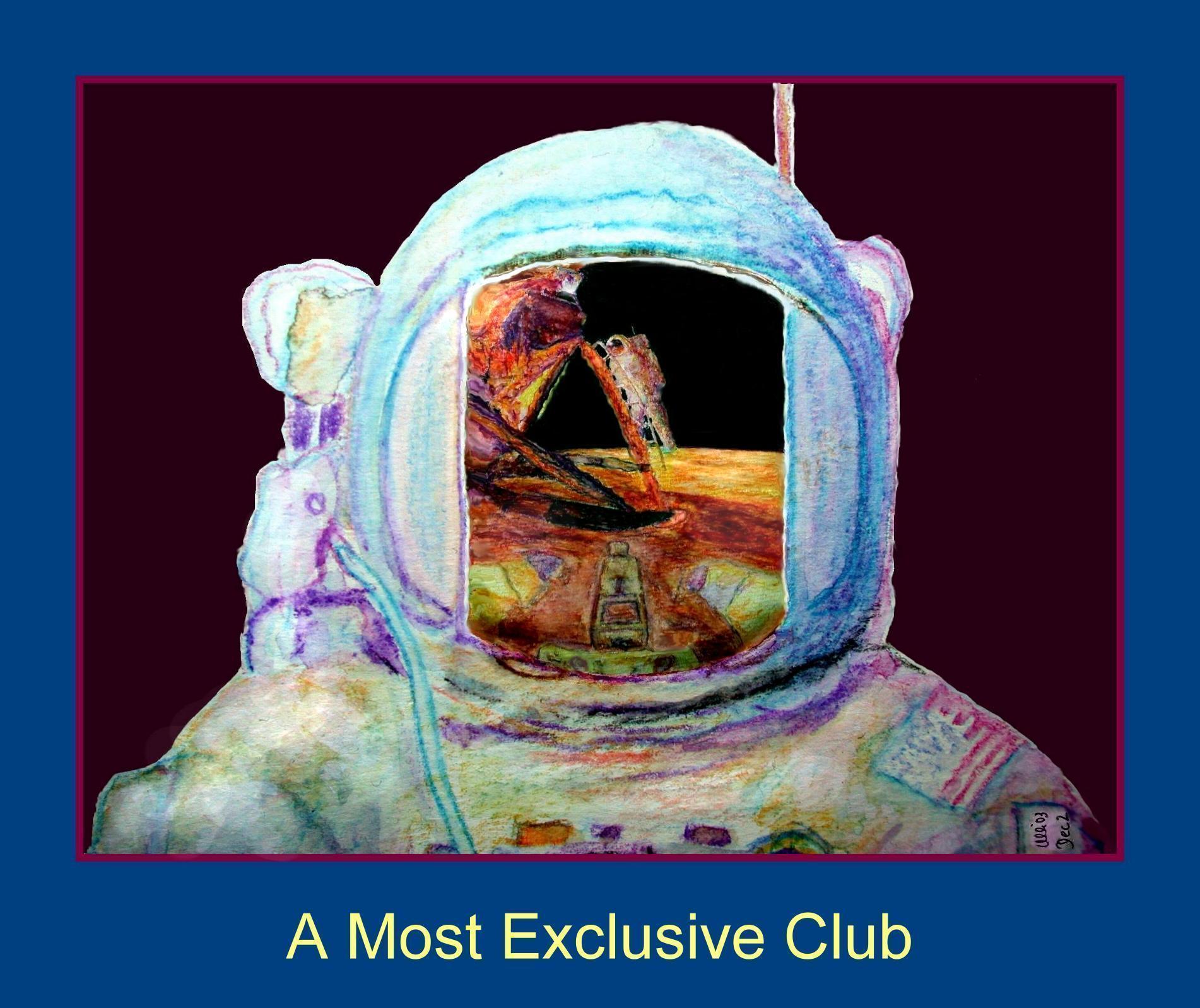 So far, the Moonwalkers' Club only has twelve members. In a reversal of their actual roles, we see Alan Bean preparing to take a picture of Pete Conrad coming down the ladder for the first time. Ulli writes: "I have done this little water color sketch mainly to exercise difficult sceneries as they are caused by the reflections in the golden sun visor. This one shows a motif that was never documented by photography or TV - a reflection of an Apollo astronaut coming down the ladder of the LM." |