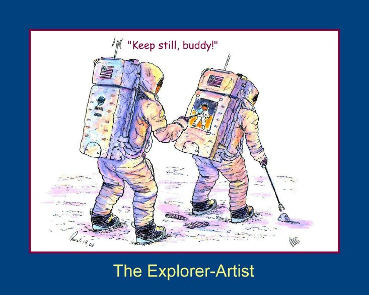 Ulli writes: This drawing is dedicated to Alan on the occasion of his 74th birthday on March 15, 2006. Wouldn't it be fun? Pete's PLSS as a mobile lunar easel for the No. 1 ExplorerArtist. But of course that's pure fantasy. Often Alan is described as an artist who flew to the Moon, but that's a stereotypical idea. He walked on the Moon as a highly-trained astronaut who was completely focused on the success of his mission: no time for sketches, no time for little paintings (not even on the back side of his Commander's PLSS). By the way PLSS stands for "Painter's Lunar Surface Support". |