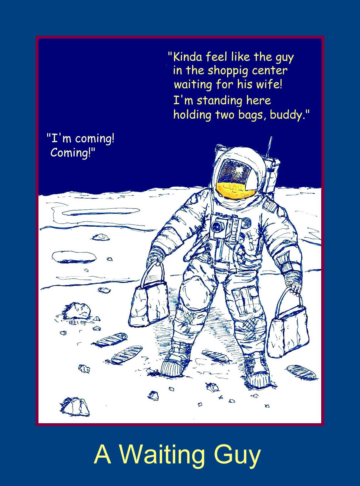From the Apollo 12 Lunar Surface Journal: 118:43:00 Conrad: Hey, Al, dump some of this dirt...Come here, Al. 118:43:03 Bean: Just a second, let me move this TV. 118:43:06 LM Crew: (Garbled) 118:43:08 Bean: There you go. It (the TV lens)'s wide open now, in the dark. Okay, Houston; it's wide open in the dark. 118:43:18 Gibson: Okay, Al. (Pause) 118:43:27 Conrad: Kinda feel like the guy in the shopping center waiting for his wife. 118:43:32 Bean: Okay. 118:43:33 Conrad: I'm standing here holding two bags, buddy. 118:43:36 Bean: I'm coming! Coming! (Pete giggles; Al joins in). |