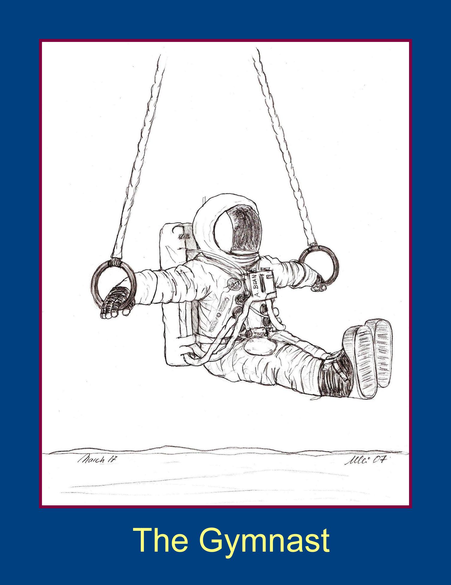 "The sketch is intended as reminder for Alan to keep in good shape and good spirits, because there are still many Apollo motifs that have to be painted. The sketch is also motivated by the fact that Alan was a good athelete in his younger days." Editor's Note: If only it had been possible to bend the AL7 suit hips like that. However, without the waist convolute added for the Rover missions, that part of the suit was pretty rigid. |