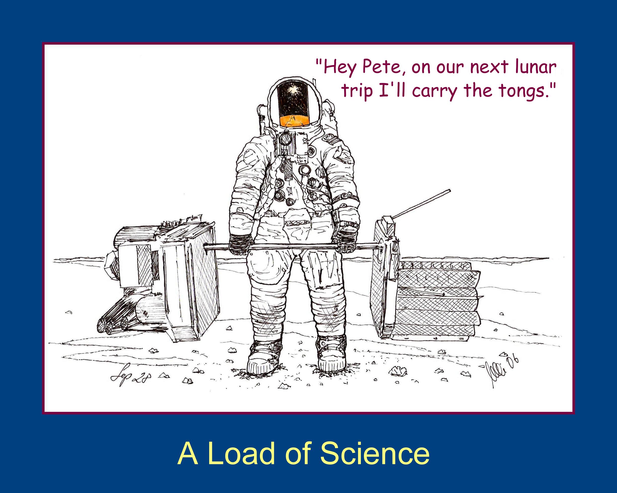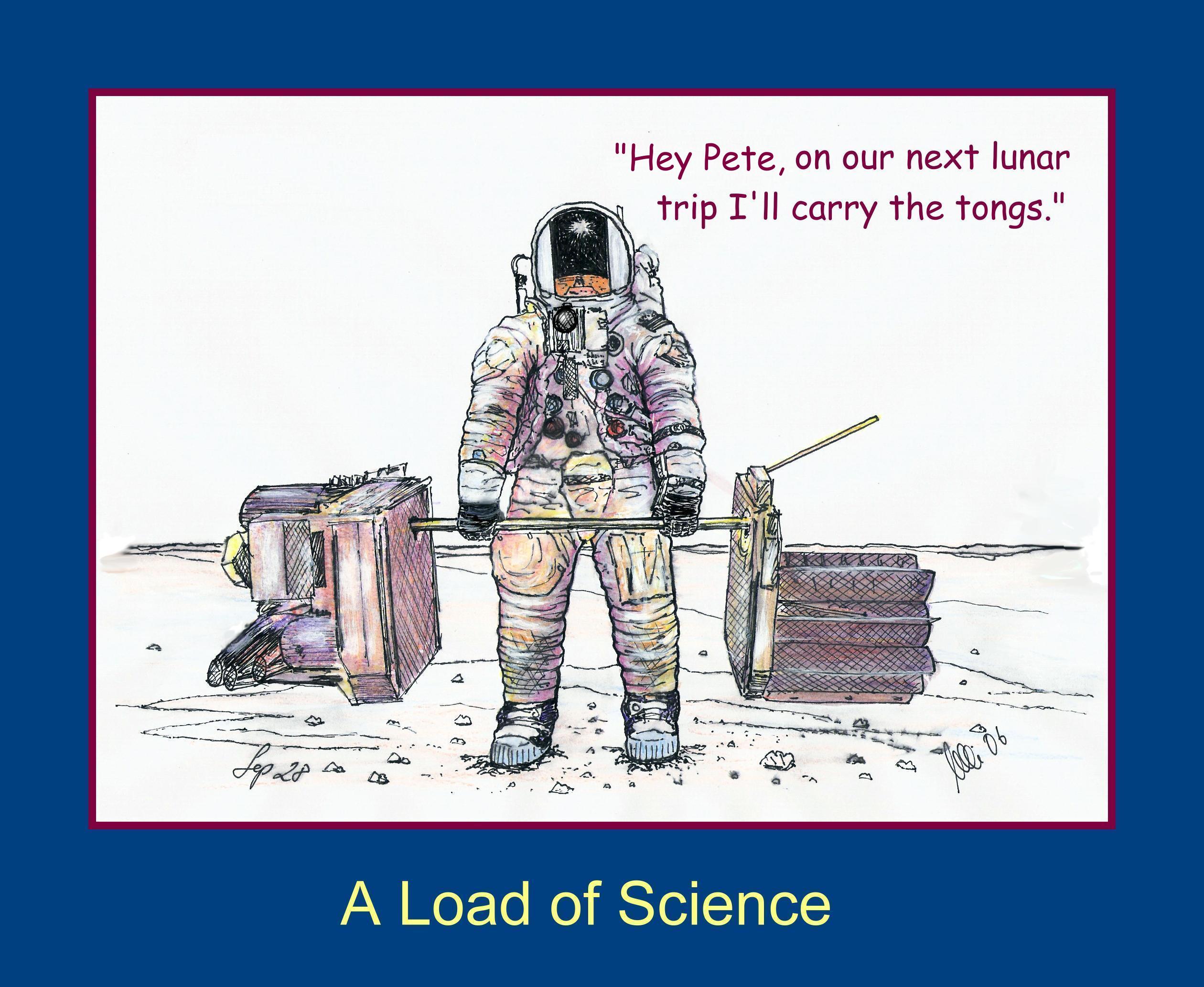 Some people may wonder about the division of labor during the Apollo missions. It was always the Lunar Module Pilot who had to carry the ALSEP; and, on the later missions, they never got to drive the Rover. During the 12 December 1969 Apollo 12 post-mission press conference, Pete and Al showed a picture of Al carrying the ALSEP. He commented, "I think it illustrates who played the mule on the flight." See, also, Al's painting Scouting for the Right Spot.