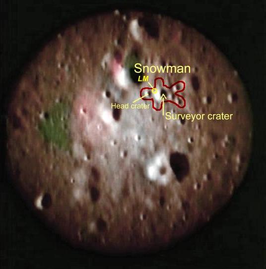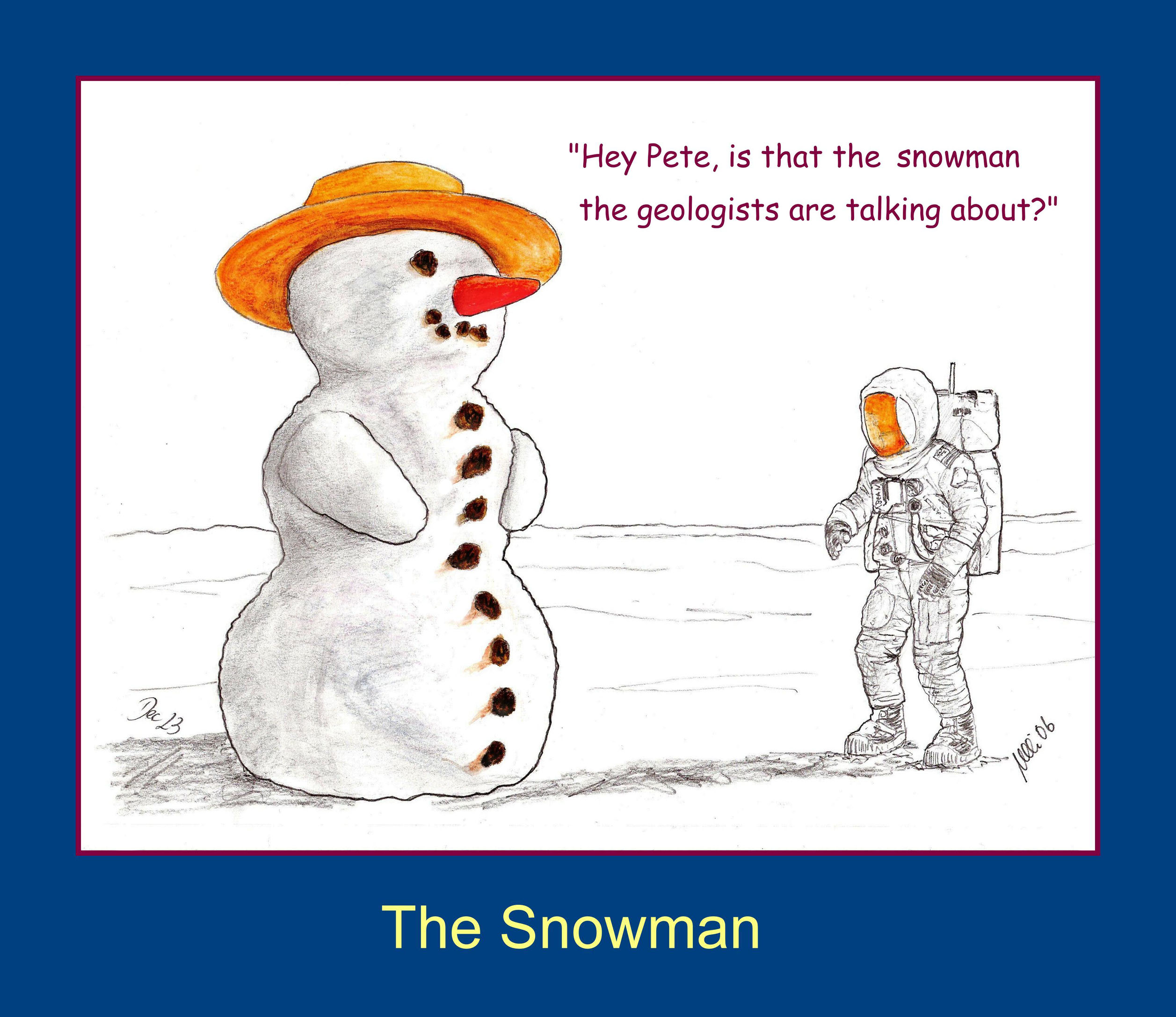 Ulli writes, "This sketch plays with the name of the Apollo 12 landing area. The principal landmark identifying the landing site was a pattern of craters called the 'Snowman' with Surveyor Crater as it's torso and Head Crater as ... well, yes ... its head. A labeled frame from a 16-mm film Dick Gordon shot through the sextant of the Command Module shows a rough outline of the Snowman, with Surveyor Crater, Head Crater, and the position of the LM marked as well."