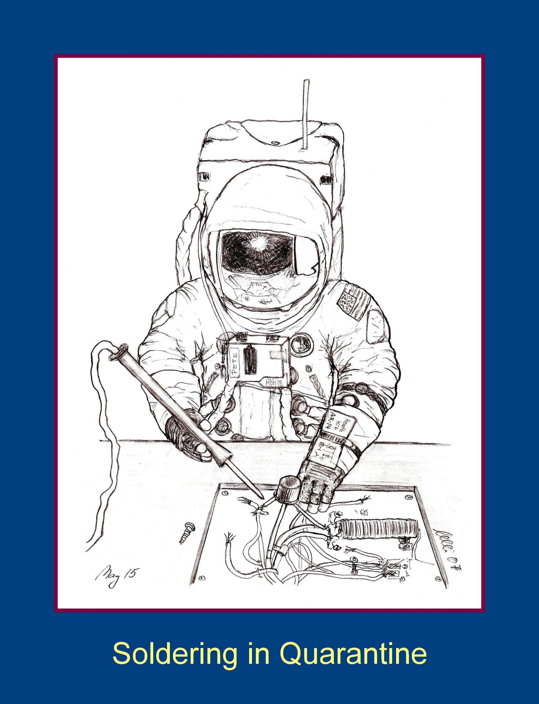 "This sketch deals with the fact that good old Pete - confined in biological quarantine with his crewmates after their moon trip - had nothing better to do than putting together a Hi-Fi AM/FM radio for the Conrad family's living room. While Gordon and Bean were reading, writing letters and watching movies, Pete was soldering." "That's another illustration that Pete was something special - colorful!" "His old one had conked out on him some time before the flight; and he figured that quarantine would be a good time to build another one. He arranged for the FM kit and the assembly tools to be waiting for him in the LRL when he entered the quarantine." "One night in the LRL, Pete jokingly said that, if he was going any sleep, someone was going to have to get him another bed; his was all covered with radio parts." Peter Conrad recalls that it was a Heathkit radio set. 'It had transistor boards in it instead of tubes. When he got home from the quarantine, he showed me all the boards he had soldered together while he was locked up.'"