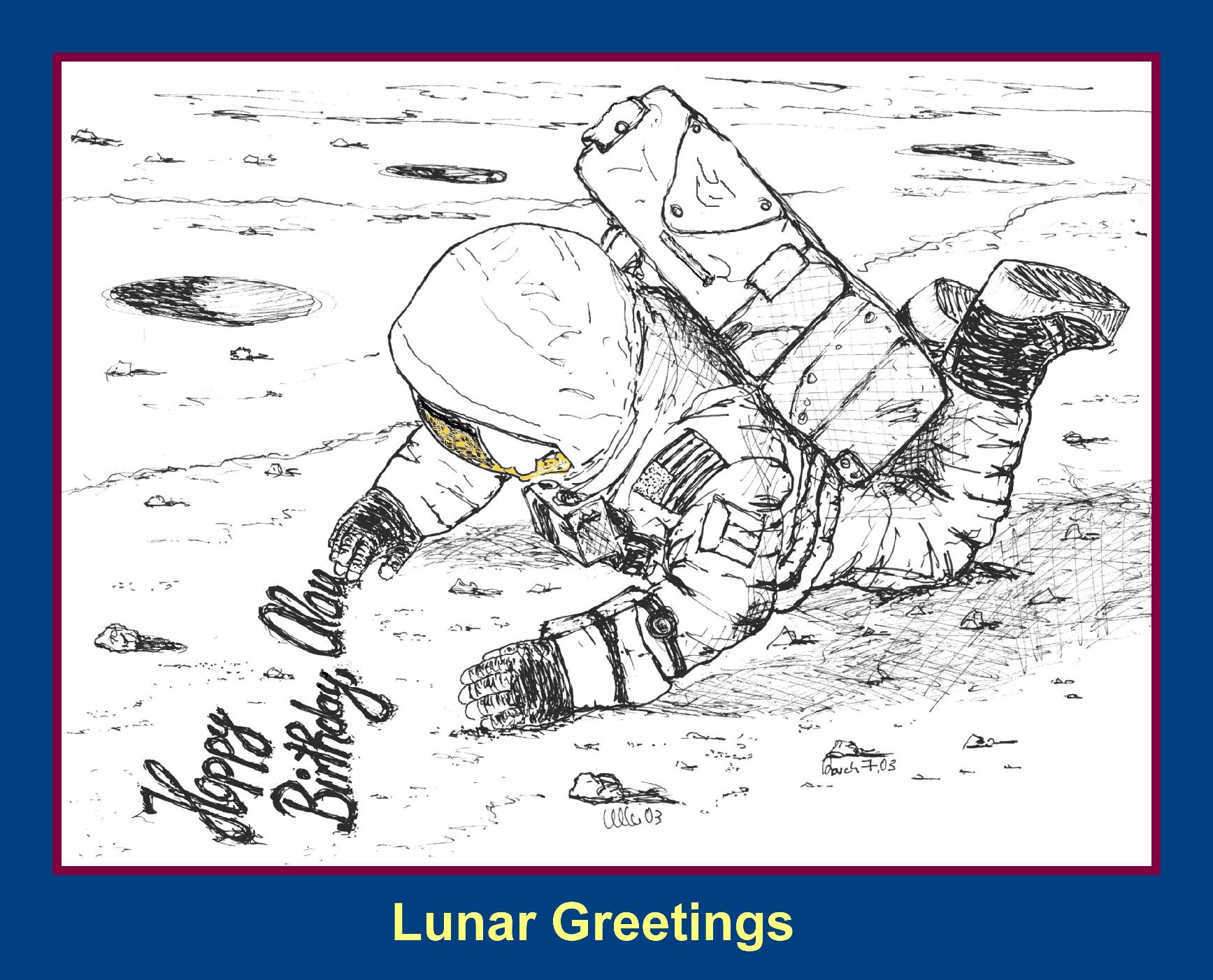 Ulli writes "This sketch was inspired by the background story of Al's painting Tracy's Rock. I 've drawn Pete writing his greetings to Al in the lunar dust. "Al will celebrate his birthday on March 15th - 71 this year (2003) - but as Einstein always said: 'Getting older is relative'." |