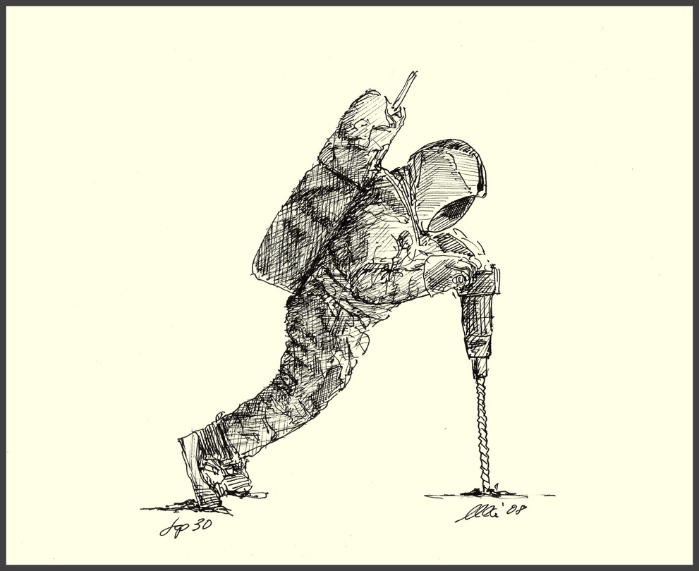 It may look like Dave's pushing hard on the drill but, as he said later, "You can't push on it very hard, because you don't weigh very much. You can't put a lot of force on it, even if you put your whole self on it, because your whole self isn't very much force." Here's a link to video of Dave drilling.