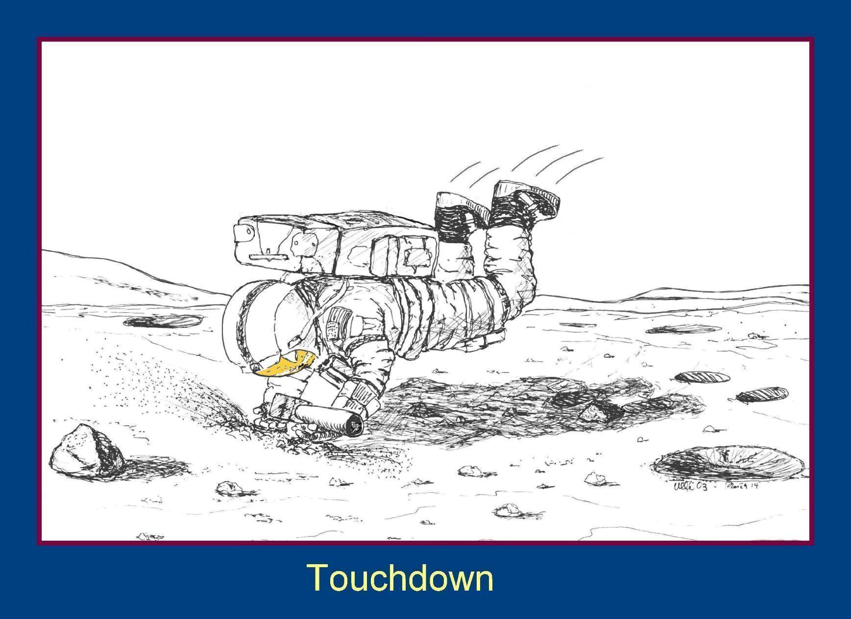 at 165:32:00 GET (EVA 3, at Hadley Rille). "Unintentionally, Dave Scott caught his left foot on a rock and fell onto his hands and knees throwing the 500mm Hasselblad in the lunar soil (another nightmare for a Hasselblad and Zeiss fan). "I drew the scene in a more 'camera protective manner' - especially for people who like American football." Ulli notes that Alan Bean's painting Telephoto Opportunity shows Dave Scott with the camera just a couple of minutes before he tripped. |