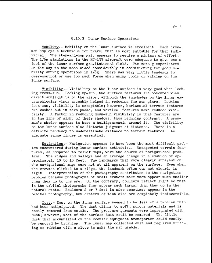 "The little dust that accumulated on the modular equipment transporter could easily be removed by brushing. The lunar map collected dust and required brushing or rubbing with a glove to make the map useable."