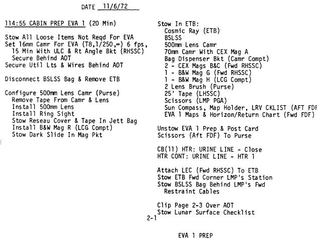 While packing the ETB with used film magazines and loose rocks, Jack says, "Let's see.  We better take those dust brushes (probably meaning the lens brushes) up there (to the cabin)."  This is a sensible departure from the cuff checklist, given how dirty everything got after they lost a fender.