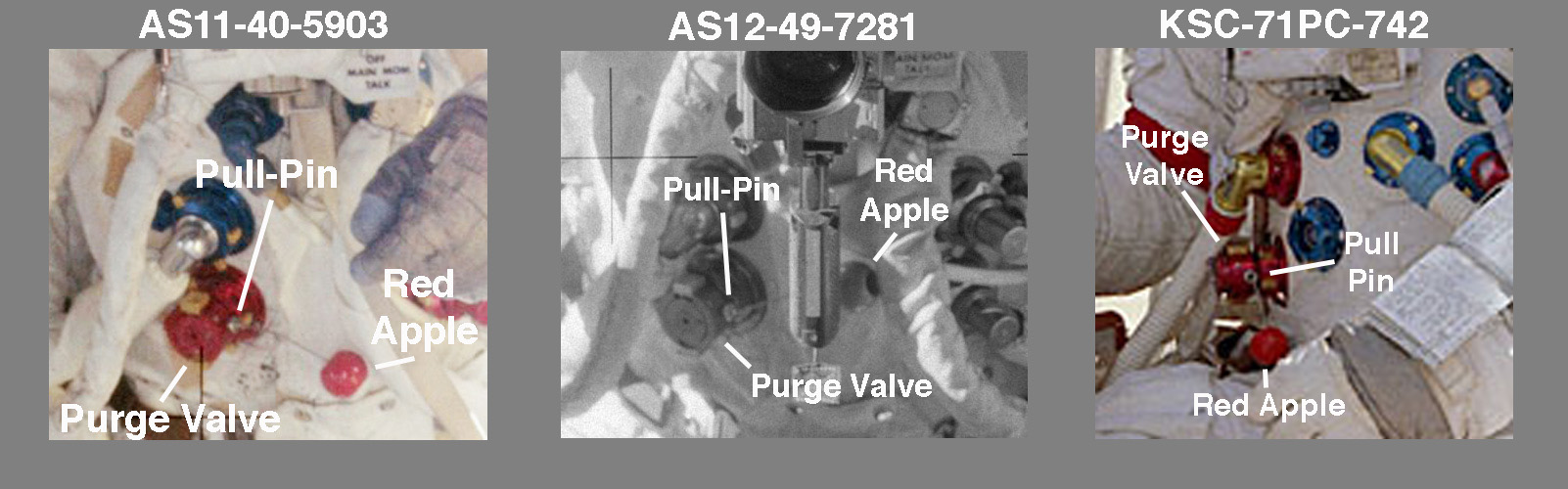 Video of Charlie doing the installation at 122:25:42. John's pin comes out for the second time as he is getting seated at the end of their brief stop at Halfway Crater. John's pin comes out again while he's getting off the Rover at Station 2. Later, just as they are about to leave Station 2, Tony asks Charlie to make sure John's pin is still in. It is. During the EVA-1 debriefing, Tony tells them that people are thinking about the problem of John's purge valve pin coming out but adds, "I wasn't sure you had a problem." John replies, "I don't think we've got a problem, either, if I can figure a way to keep (from) pulling it every time I get in and out of the Rover. If I can't do that, why, we'll just keep putting it back in." In an extract from the Apollo 16 Technical Crew Debriefing, John says that, during EVA-2 prep, they turned the purge valve so that the pull-pin and Red Apple was pointing away from his naval. During the suit integrity check, he made sure he could reach the Red Apple, which he could. There were no further problems. Post-mission testing confirmed Charlie's suspicion that John was catching either the red apple or lanyard on his seatbelt while he was getting off the Rover. Photo AS16-114-18388 shows the position of John's Red Apple during EVA-1, just above his right leg; AS16-117-18825 shows it during EVA-3, just below his camera, peeking out behind the sample bags. During EVA-2 preps, Tony England passes along a suggestion that John use something as a lanyard to secure his Red Apple to a fitting on the front of his suit. John doesn't think much of the idea and ends up not doing anything other than re-positioning the Red Apple. Based on Tony's conversation with the crew during the EVA-1 debriefing and his emphasis that they do 'whatever you think's necessary, he doesn't think much of the idea, either. The Red Apple was easy to spot if the pin did come out. |