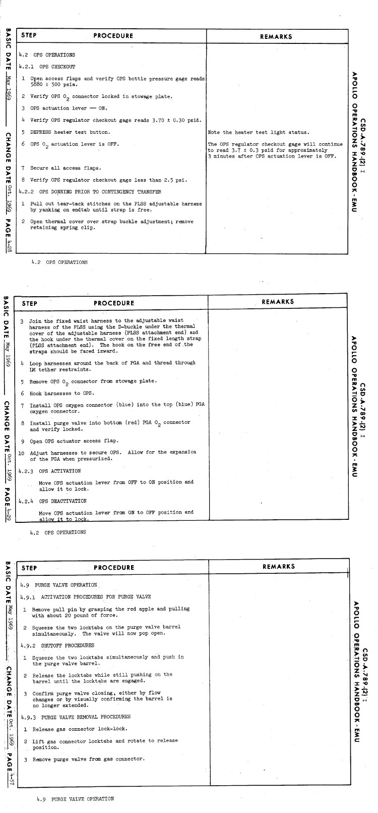| Apollo 16 | 154:15:50 | The OPSs are identical but, because the antenna on John's broke during post-EVA-2 ingress and his PLSS is the only one with comm electronics for relaying to the LM or LCRU, they will swap OPSs for EVA-3 |