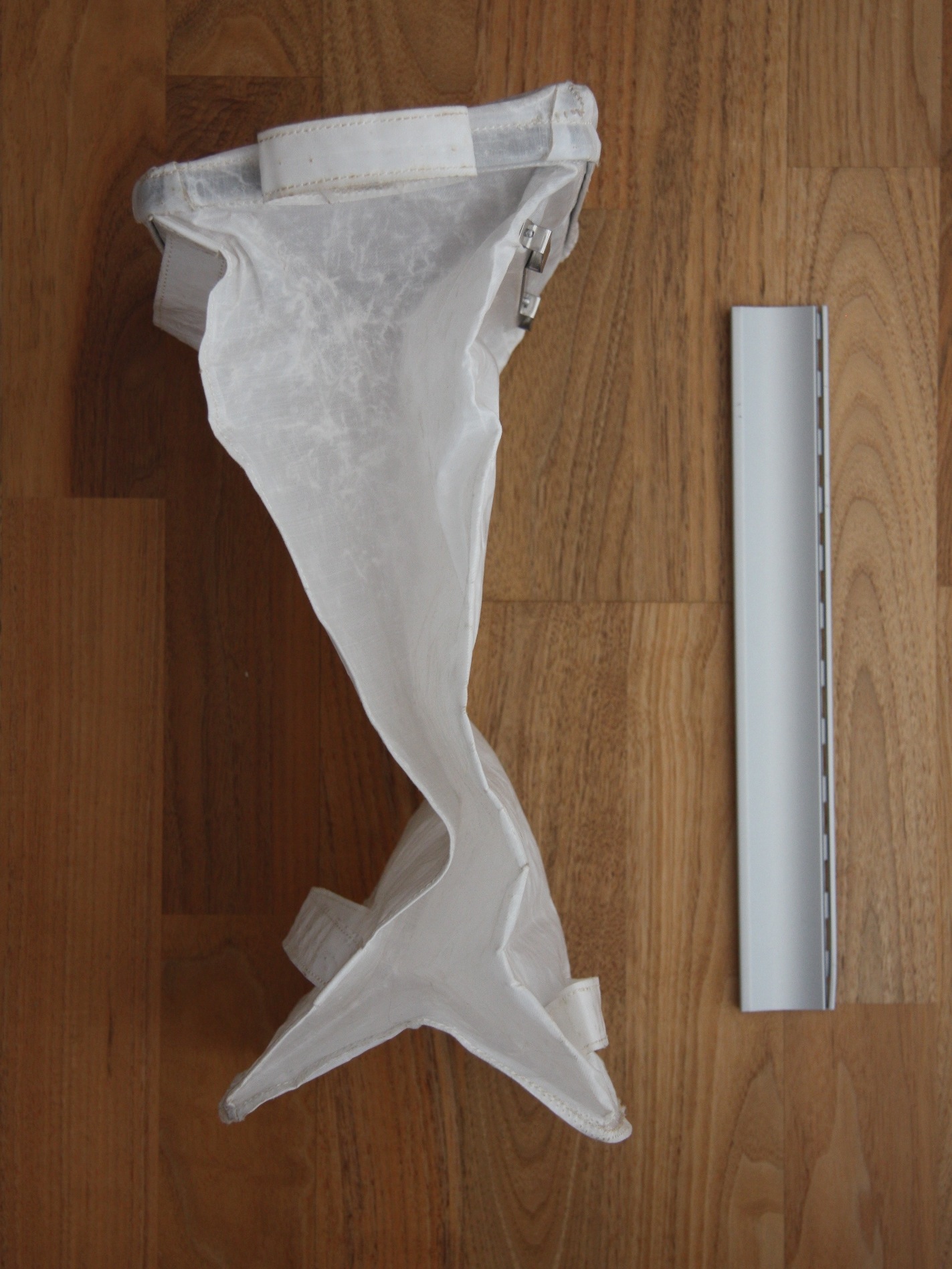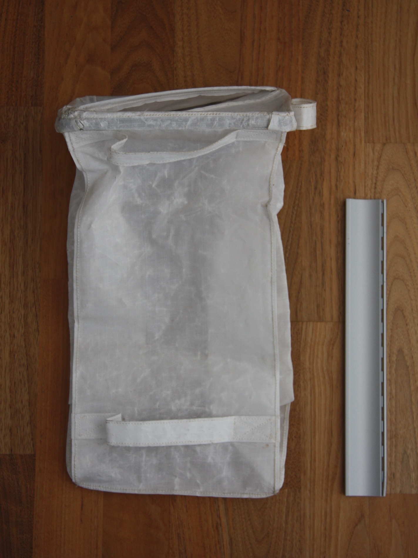This pre-flight photo shows the interior of an SCB with two drive tubes in stowage sleeves. The one on the right is labeled "L" for "lower" and the one on the left "U" for "upper". The rim at the bottom of the "lower" is made of hardened steel to minimize damage when the tube is hammered into the ground. (click on the image for a larger version)