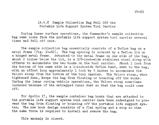 carrying any extra weight." At the end of the EVA - and after some redistribution of samples - they report SCB weights of 24 and 35 terrestrial pounds. At the end of EVA-3, they report two other bags at 32 pounds each. In lunar gravity, then, a full SCB would weigh 5 or 6 pounds and, while the extra weight was noticeable hanging from the side of the PLSS, it was not troublesome. |