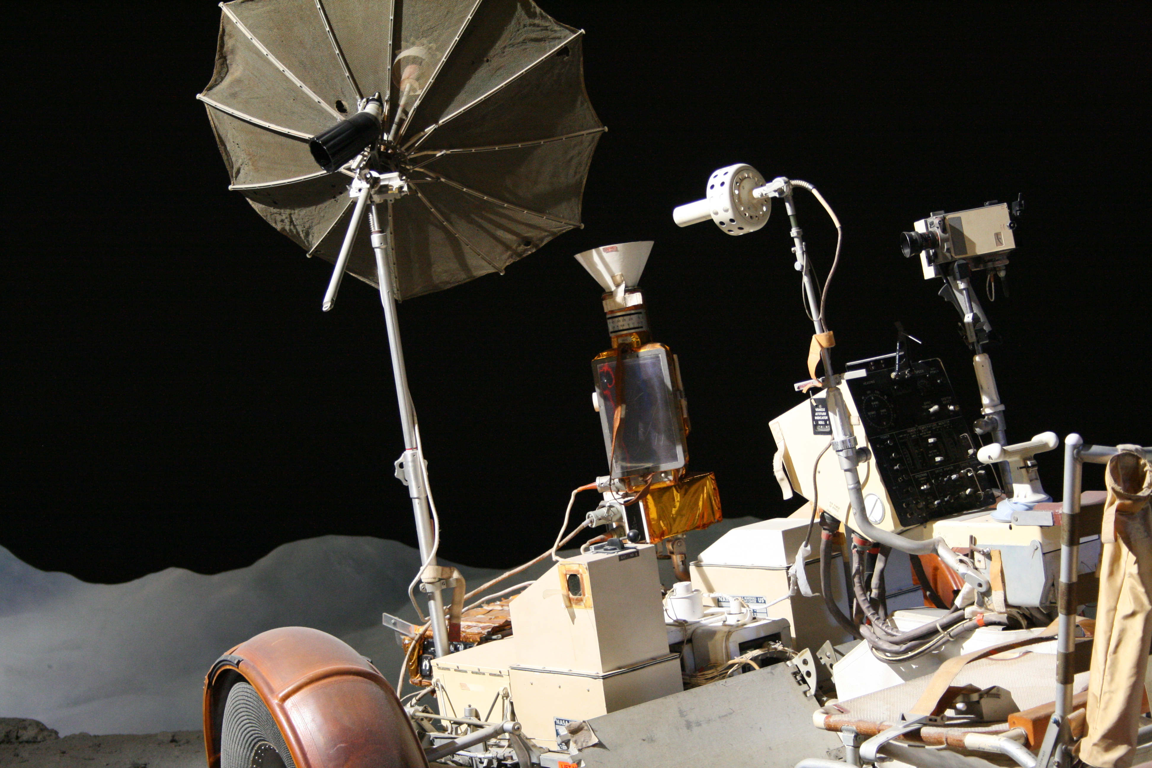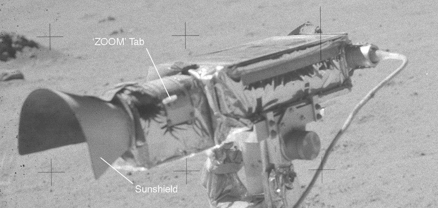 This image shows the TV mounted on the LRV Qualification Unit that is on public display at the Smithsonian Institution's National Air and Space Museum. It shows a Velcro patch on the top of the lens barrel and an additional Velcro around the lens that were use to secure the TV sunshield/sunshade that was first flown on Apollo 16. See, also, a larger version of this photo, an alternate view from above the camera, and a detail from AS16-106-17381, which shows the sunshield as installed. A detail from AS16-117-18752 shows a short strap fixed to the top of the sunshield which undoubtedly mated with the Velcro on top of the TV lens barrel. Qual Unit photos courtesy Allan Needell. A second Qual Unit is on public display at Space Center Houston. It has a sunshield installed, as shown in a detail from a photo by Mike Gentry.
