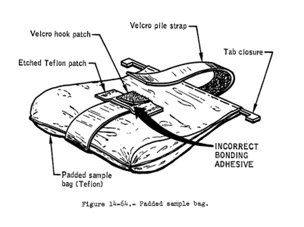 because the adhesive would not hold during pull test. Lunar surface photographs verified separation occurred between the sunshade and Velcro cemented to the sunshade. For Apollo 17 it is directed that stiching or brads be added to prevent this occurence." |