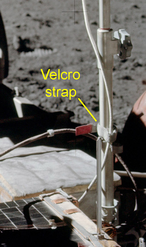 adhesive would not hold during pull test. Lunar surface photographs verified separation occurred between the sunshade and Velcro cemented to the sunshade. For Apollo 17 it is directed that stiching or brads be added to prevent this occurence." Photos of the sunshield and the Velcro pile on the camera can be found at the link in the preceding column and in the LRV Velcro section below. |