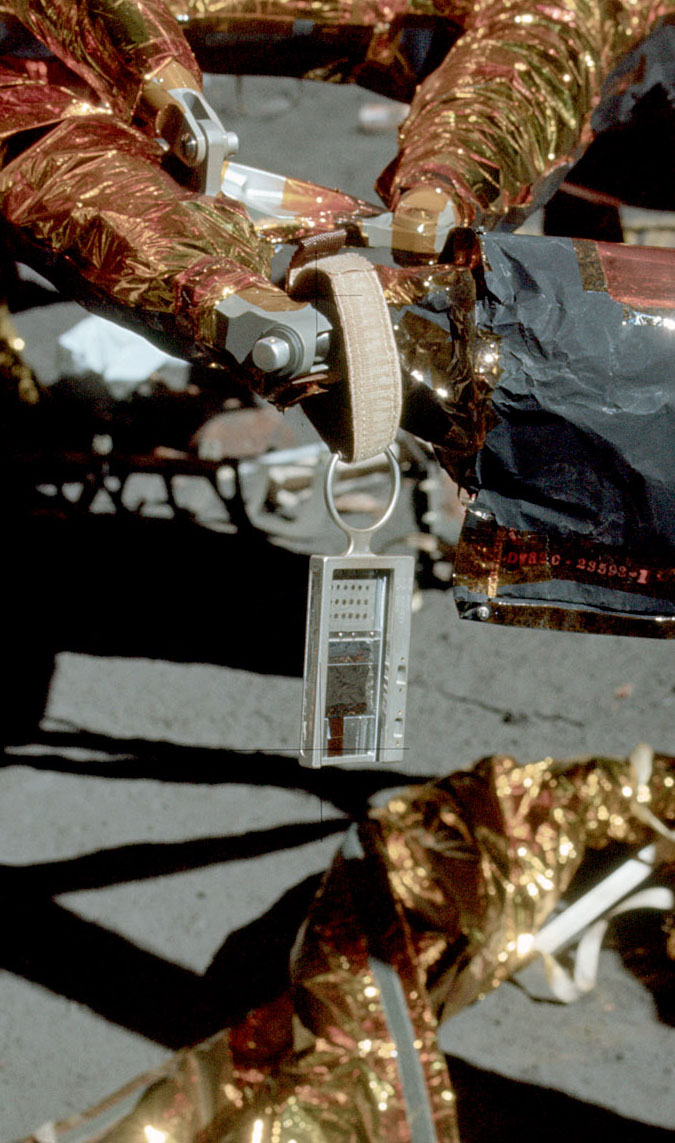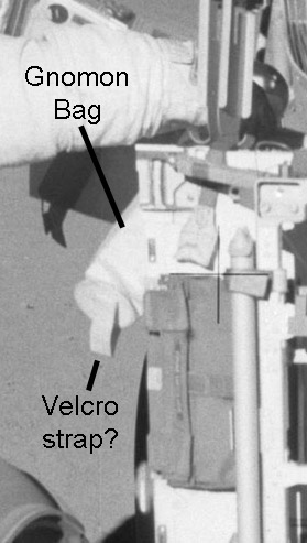 132:09:02 | Ed notices that two of three pieces of Velcro, glued on the MET handle - or "tongue" - to hold the traverse maps, have come off. This suggests failure due to heating of the adhesive. According the the Apollo 14 Mission Report, the two pieces that came off "had been glued on a surface having a different finish than the one to which the (remaining piece of) Velcro adhered." See, also, discussion of adhesive failure on the cover of the Apollo 17 SEP receiver thermal bag. See, also, Section 3.7 in the Apollo 14 Mission Report. |