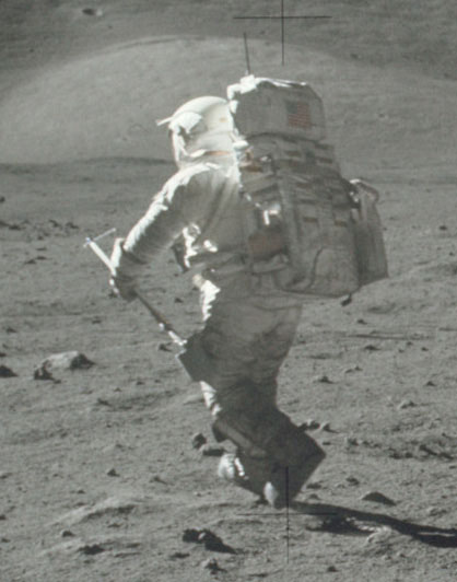 AS15-85-11500 | Shows the open pocket cover on Dave's right thigh. Dave may be about to step to his right to take the second frame of a cross-Sun stereopair. |