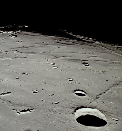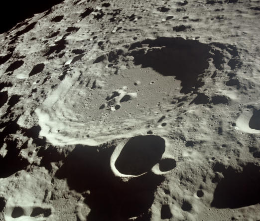 Oblique view of the lunar far side from lunar orbit. Large central crater is International Astronomical Union #308. It has a diameter of 50 statute miles.