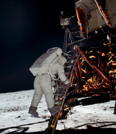 Once the LM inspection and the sample collection were completed, Aldrin got out of the LM and climbed down the ladder, with Armstrong providing voice guidance. Armstrong was taking pictures of the event at the same time. The two then "unveiled" the plaque mounted on the strut behind the ladder by removing a protective covering. They read the inscription for the benefit of their world audience.