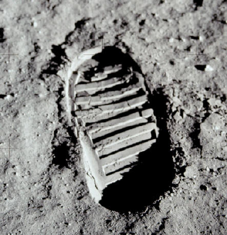 Armstrong removed the TV camera that had covered his first step on the moon and transmitted several panoramic shots of the area surrounding the LM. The pictures came through with remarkably good definition and showed a fairly level area pitted with small craters. There was a scattering of boulders of varying sizes and shapes, some of them as large as two feet in their biggest visible dimension.