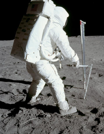In the long prelude to the flight, scientists had reservations about man's ability to move around in the lunar environment. The space suit, with its back pack of life support equipment, has an earth weight of 180 pounds. Moreover, in the lunar vacuum, the suit's internal pressure inflates it - a condition that substantially reduces its flexibility. There were also doubts as to human ability to adapt to the one-sixth gravity of the moon. It was feared that there might be a disorientation that might make movement awkward.