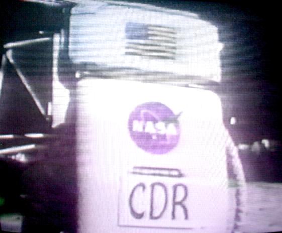 As a final note, Ulrich Lotzmann calls attention to some TV footage from an Apollo 11 training session - very likely a session on 18 April 1969 to which the media was invited. Lotzmann has provided stills showing a 'CDR' sign on the back of Neil's PLSS and an 'LMP' sign on the back of Buzz's. Clearly, some one realized that a means of distinguishing the crewmen was needed for the media session, but there was no follow through for the mission.