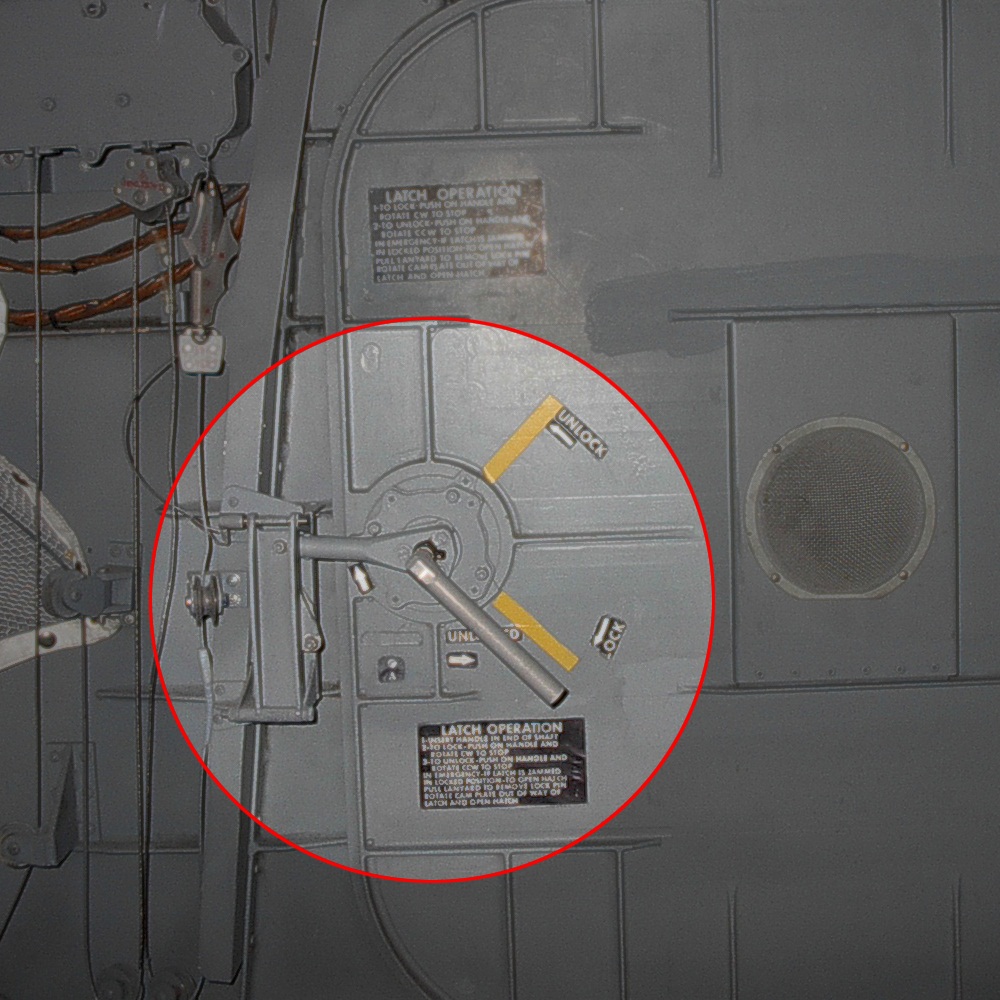 [The lock lever is a very simple mechanism, with a short latching end and a longer handle pointed toward Buzz's side of the spacecraft. Thomas Schwagmeier has provided a labeled photo detail. The latching decal reads, Latch Operation: 1.Insert handle in end of shaft; 2. To lock - push on handle and rotate CW (clockwise) to stop; 3. To unlock - push on handle and rotate CCW (counter clockwise) to stop. In emergency - if latch is jammed in locked position - To open hatch pull lanyard to remove lock pin, rotate cam plate out of way of latch and open hatch.]