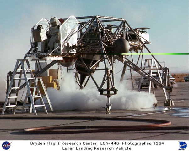 [Following our review of the landing, I asked Neil about the value of the Lunar Landing Training Vehicle and it similar predecessor, the Lunar Landing Research Vehicle. These free-flying craft (shown here with test pilot Joe Walker at the controls) were built for NASA by Bell Aerosystems, Buffalo, NY and had a General Electric CF-700-2V jet engine mounted pointing downward so that, in effect, it removed 5/6th of the vehicle weight. According to Journal Contributor Ed Hengeveld, "lift for the remaining one-sixth of the LLTV's weight was provided by two 2250 Newton hydrogen peroxide lift rockets." Like the LM engine, these lift engines could be gimbaled. The vehicle also had sets of thrusters. A landing in the LLTV was not an exact duplicate of a LM landing on the Moon, but the two vehicles did share many performance similarities. Two LLRVs and three LLTVs were built and three crashed during test flights and training. All of the pilots - including Neil in the first of the three accidents - ejected safely. See, also, Gene Cernan's discussion of the LLTV at 113:43:49 in the Apollo 17 Journal.]
