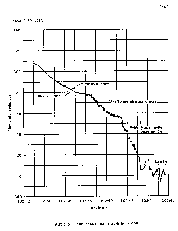 [Fjeld - "Armstrong made about four quick pitch-down maneuvers, three of them totaling about 12 degrees in 2-3 seconds. They were well within the design control regime of the LM despite his apology that they were 'spasmodic'."]