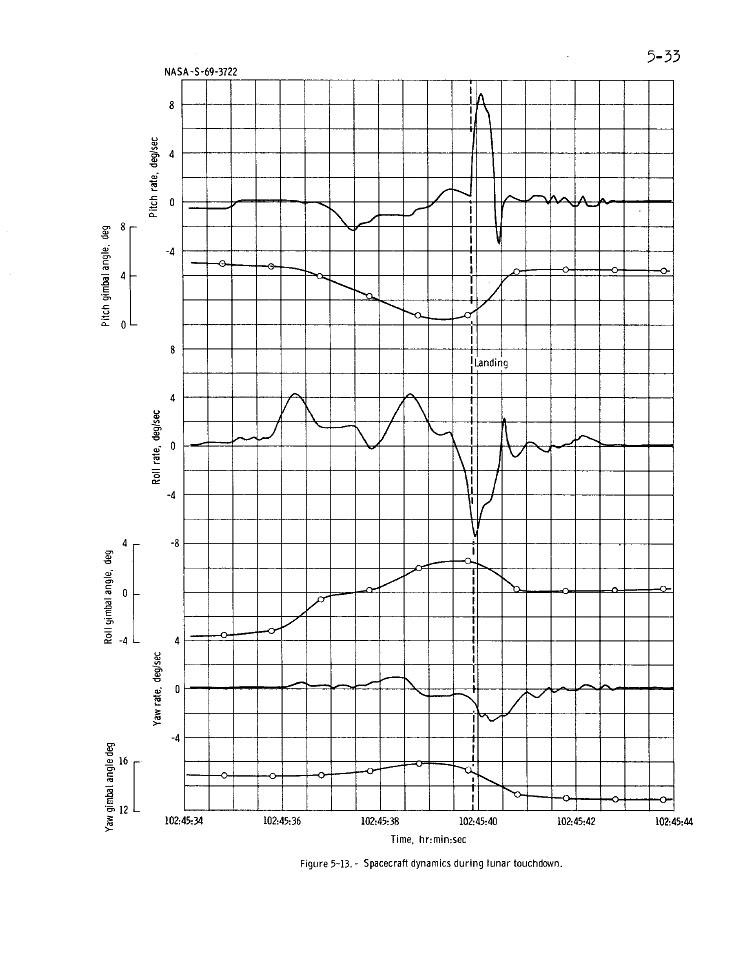 [Figure 5-13 from the Apollo 11 Mission Report shows LM attitude (pitch, roll, and yaw) during the six seconds before the landing and the four seconds after. At the begining of that interval, Neil had the LM yawed left 15 degrees, which increased to 16 degree during the final two seconds before the landing, and then decreased to 13 degress as the LM settled on the surface.]