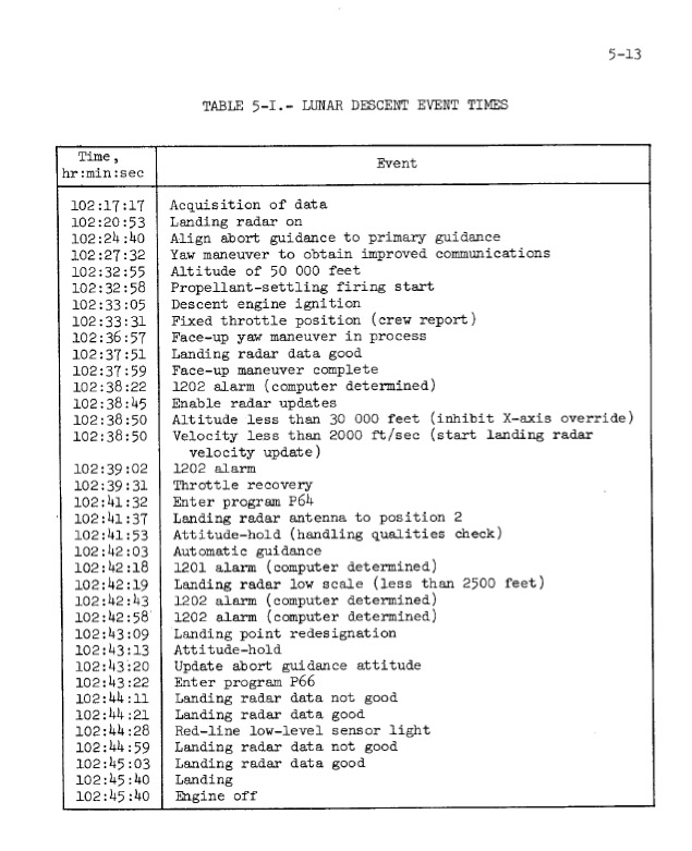 102:26:29 Armstrong: Our radar checks indicate 50,000-foot perilune. Our visual altitude checks are steadying out at about 53,000 (feet).[Armstrong - "The visual check was something that we devised ourselves, barnyard math of v = r w. 'r' would be your altitude (that you wanted to know), omega (w) was your angular rate that you determined by watching a point on the ground, and the velocity (v) was pretty well known. We measured omega by measuring the speed at which an object on the ground passed through a certain number of degrees on the (LPD) grid on the window. We just timed it on a stopwatch and had a little plot to compare it with. As the altitude decreased, we could see it was converging pretty well. It gave us an alternate check of our altitude. The importance of this is that, if we weren't in a reasonably close altitude band to our intended starting altitude, the landing guidance would not necessarily converge - the solution wouldn't converge - so it was important to us at that point that the altitude be about right when we started."]