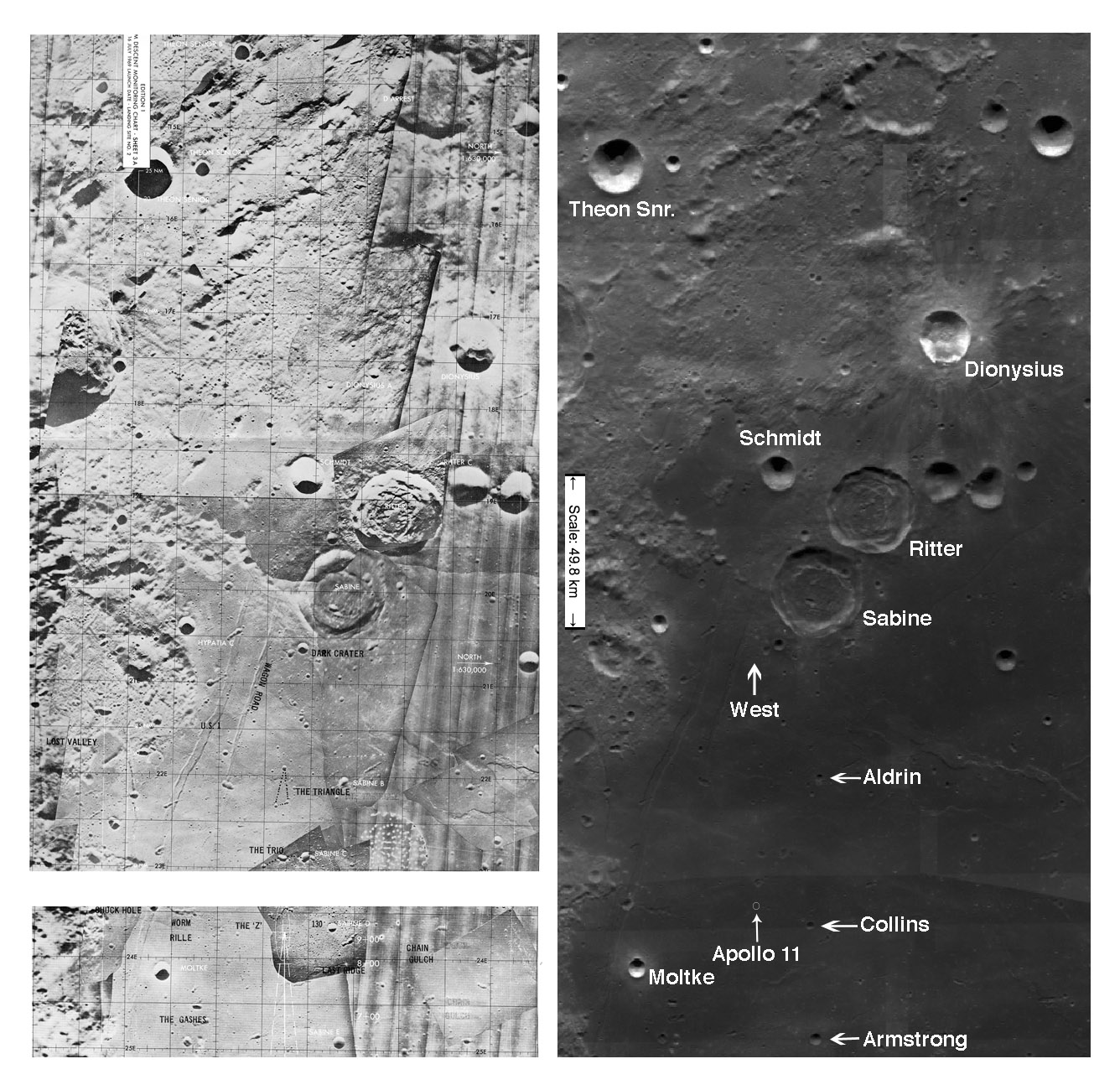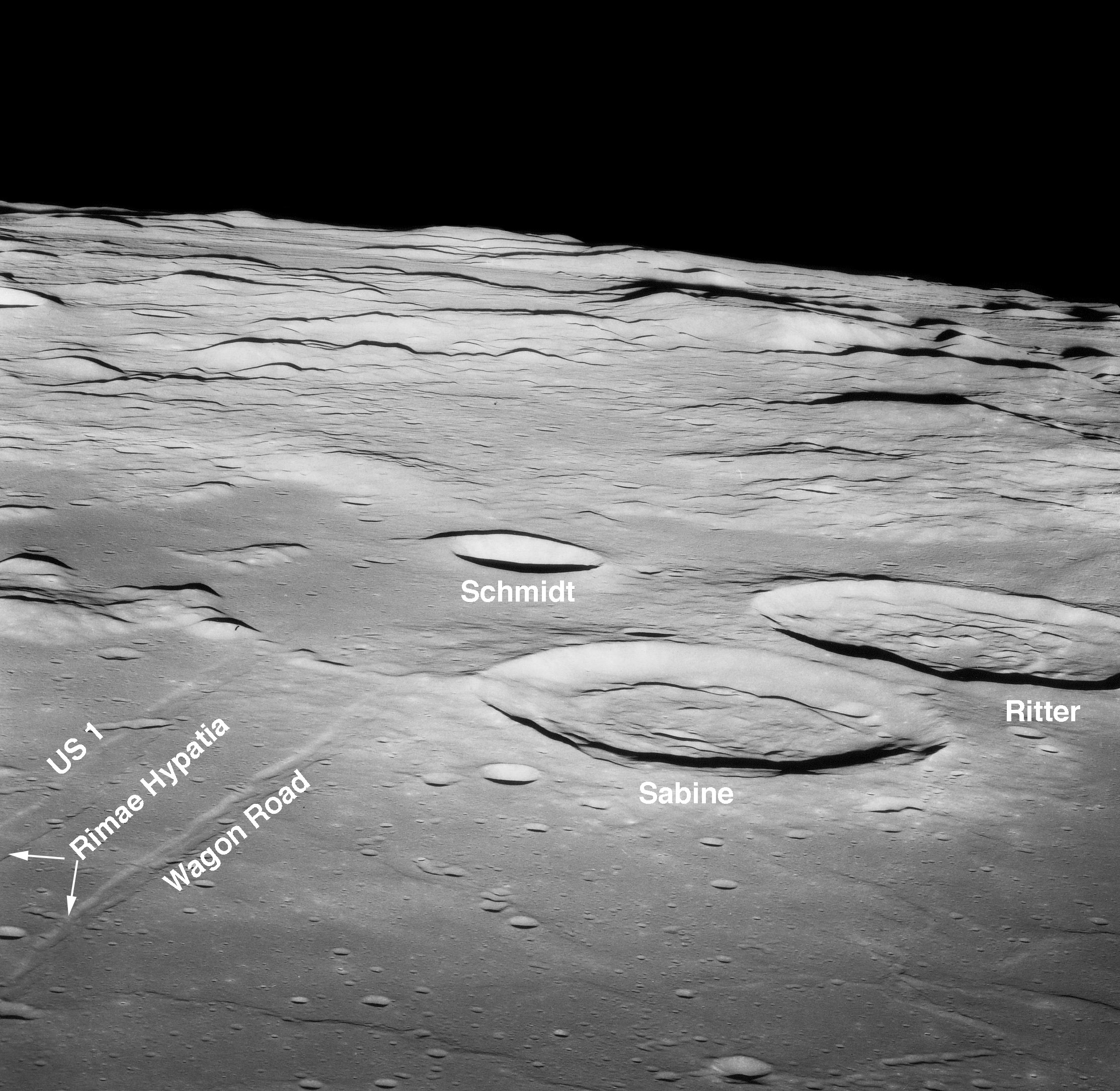[Prior to construction of the Interstate Highway System, U.S. 1 was the main north-south route along the east coast of the United States. In his book, Men from Earth, Buzz makes the following comment concerning the flight of Apollo 10. "The glaring Sun was behind Tom (Stafford) and Gene (Cernan) as they flew backwards (landing legs first) above the lunar equator towards the west. With their windows parallel to the surface, they could photograph landmarks along the approach to the Sea of Tranquility landing site." One of these landmarks is a pair of east-west rilles - Rimae Hypatia - just to the left (south) of the ascent ground track. Sometime before Apollo 11, the astronauts started calling the longer, more southerly of the pair "U.S. 1" and the shorter, more northerly rille "Wagon Road". See a labelled version of AS11-41-6121, taken from the Command Module sometime after the LM returned to lunar orbit.]124:25:39 Evans: Roger. (Long Pause)