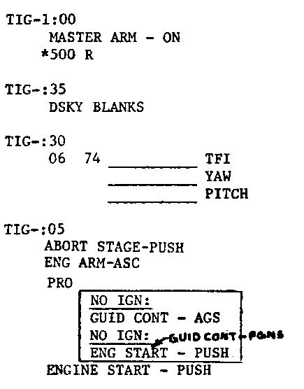 [As shown in a detail from Sur-64, At one minute before ignition, Neil turns on the Master Arm switch and Buzz goes into the DEDA to display the contents of address 500, which is the velocity to be gained along the thrust axis (plus-X).]124:21:15 Armstrong (onboard): At five seconds (before ignition) I'm gonna get Abort Stage and Engine Arm. You're going to get Proceed.