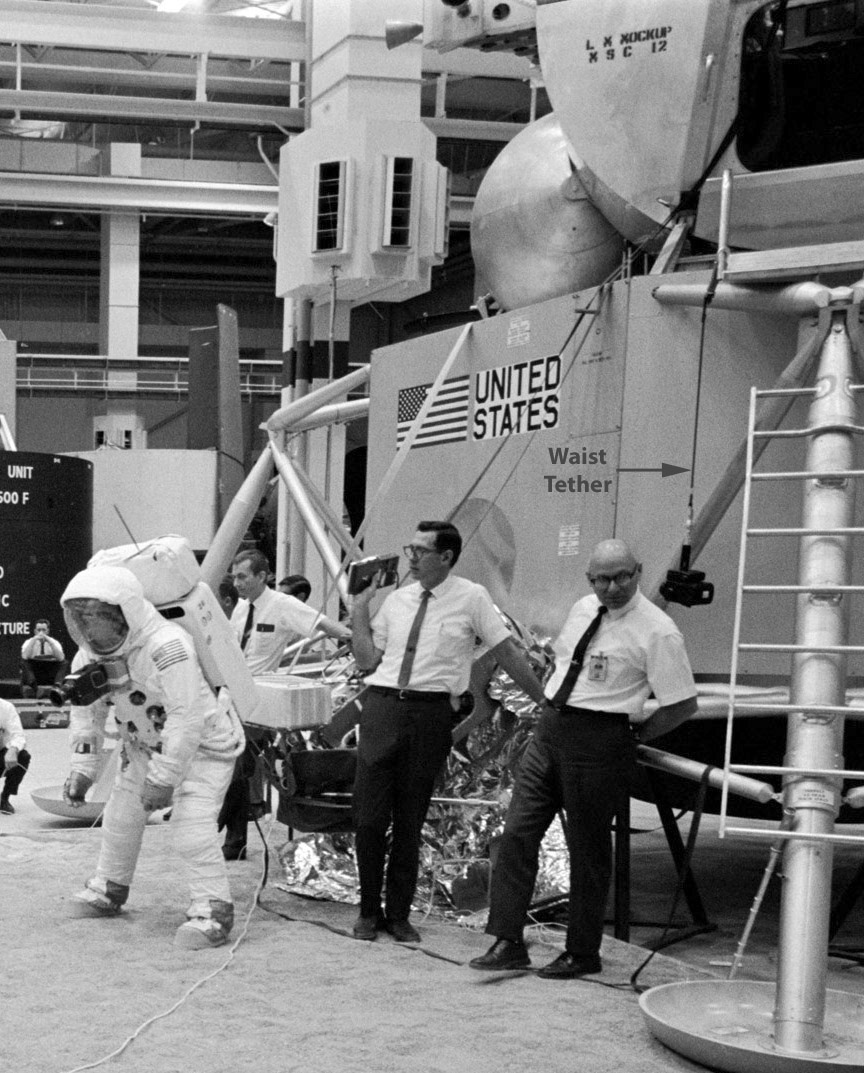[There were two waist tethers in the LEC-Waist Tether Kit. The tethers were primarily intended for use during an EVA transfer to the CM, should that be necessary. The one Neil used to suspend his legs was not the one Buzz took outside and hooked to the porch rail for possible use as a lanyard. See a labeled detail from AS11-40-5868, one of Neil's shots of Buzz coming down the ladder.]121:41:14 Evans: Roger. Copy, Buzz. Got a couple of changes to your surface checklist here. And, in general, what we're going to want you to do is P22, tracking the command module for one last hack on your position there. And this will be...In other words, P57, P22, and then to press on with the checklist.[As it turns out, the waist tether that was among a number of Eagle artifacts Neil returned to Earth in the Apollo 11 Purse is the one Neil used to suspended his legs from the AOT guard during the rest period. A full discussion includes the discovery of yellow paint flecks on the inside surface of the large hook on the returned tether that provides convincing evidence that the returned tether was the one Neil attached to the AOT guard. Ulli Lotzmann has done a sketch showing a waist tether attached to the AOT guard.]