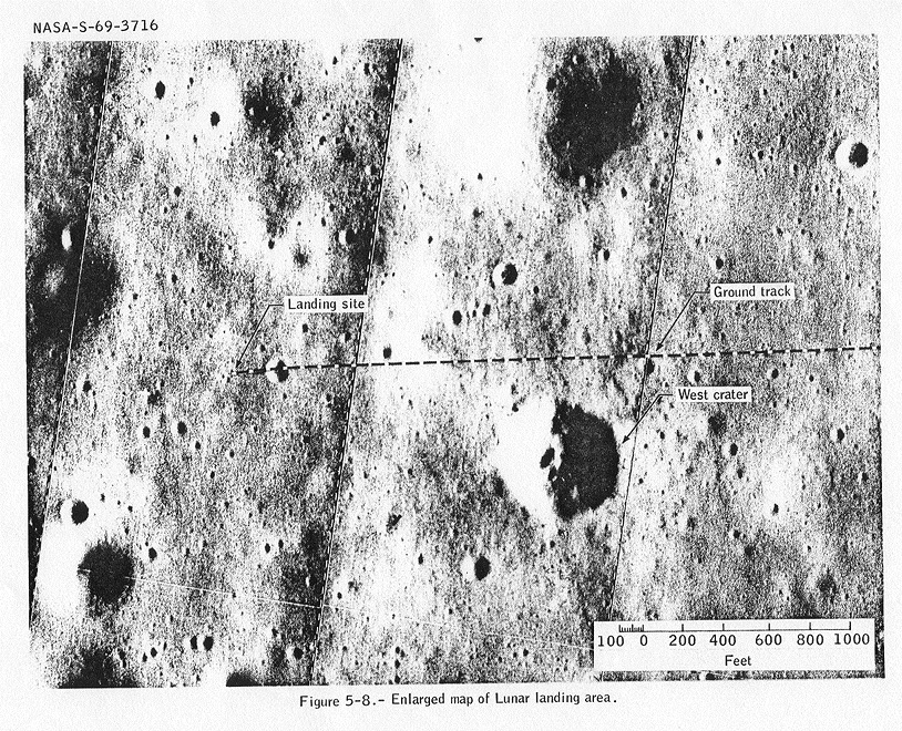 [Journal Contributor Markus Mehring suggests that this may be a crater associated with the hills on the western horizon visible from the LM windows. He also suggests that sometime while they were on the surface, Neil and Buzz suspected that the hills were associated with one or more crater rims and, knowing that they had landed long, may have tried to identify a candidate crater on the Lunar Orbiter maps they had with them. One prominent candidate is a multi-crater feature named before the flight as the Cat's Paw. See section 4.5.4 in the 2011 photogrammetric analysis of the Apollo 11 site for a discussion of these western horizon features and their identification with a crater 200 m in diameter and its near rim 200 m from the LM. This crater nearly fills the the first frame of the DAC film, which Buzz finally got going about 6 seconds after ignition. The near rim of the Cat's Paw doesn't appear in the film until about 52 seconds after ignition.]124:22:26 Armstrong (onboard): (Garbled) See if you can see the, er, Cat's Paw. (Pause) (Garbled, possibly "I'm") getting all the way in front of us to the mountains.