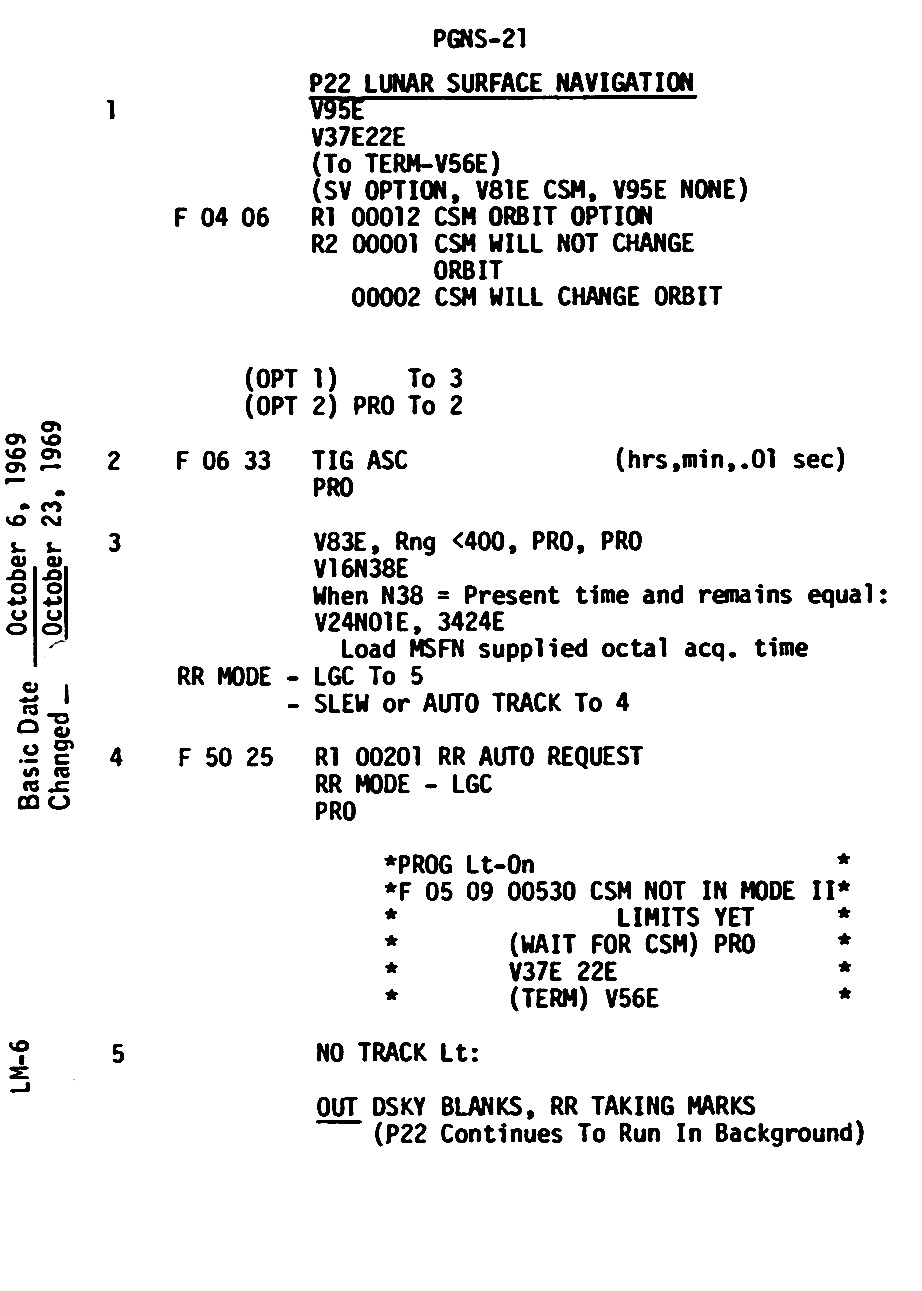 121:44:21 Aldrin: Roger. Understand that's 122:15, "Do P22 as per PGNS-20, G&N dictionary."
