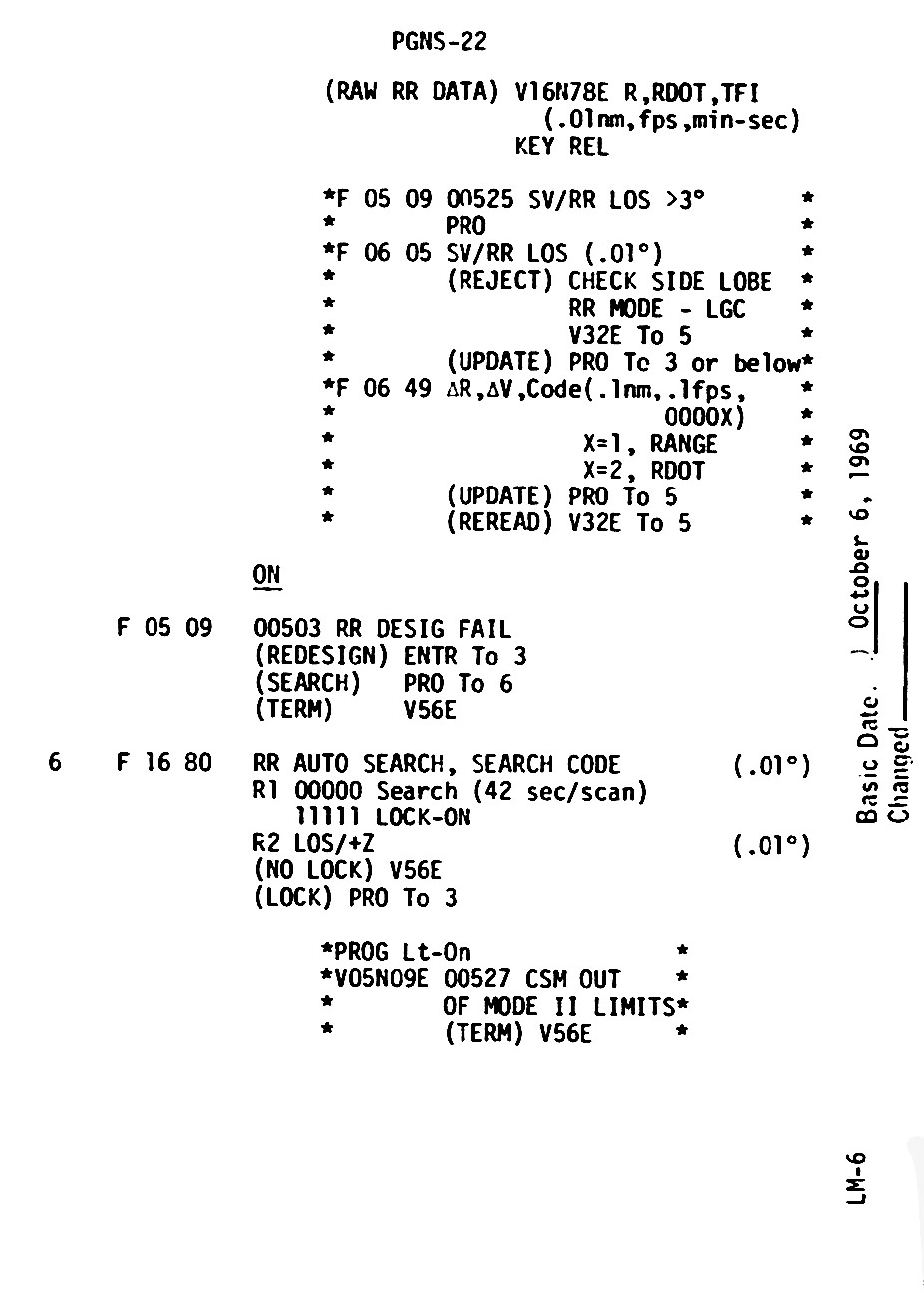 121:51:21 Evans: Roger. We agree wholeheartedly. And while you're starting on that, I'll just read these notes on P22. Call P22 possible program alarm 526, range greater than 400 nautical miles, and then use the P22 as described on PGNS-20. Take option 1 in Noun 06, and use the no-update mode. The rendezvous radar will lock on at about 25 degrees elevation above the horizon. If 503 alarm occurs, designate Fail. Key a Proceed and allow the rendezvous radar to search for the CSM. And place the range altitude monitor switch in altitude/altitude rate to prevent the tape meter from driving into the stops. And press on.