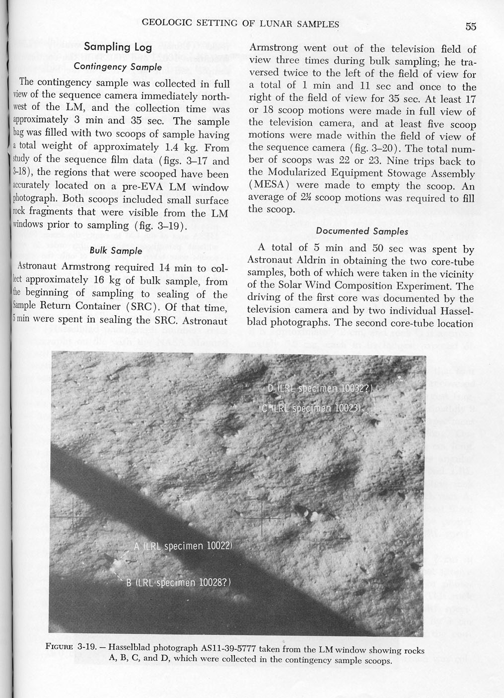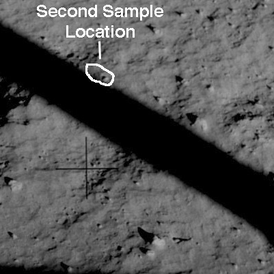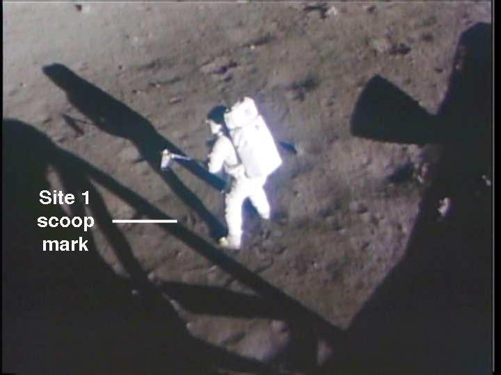 Aldrin - (Providing commentary as he watches Neil out the window) Okay. The contingency sample is down (that is, Neil has it just off the ground) and it's (garbled). | As Neil prepares to take the