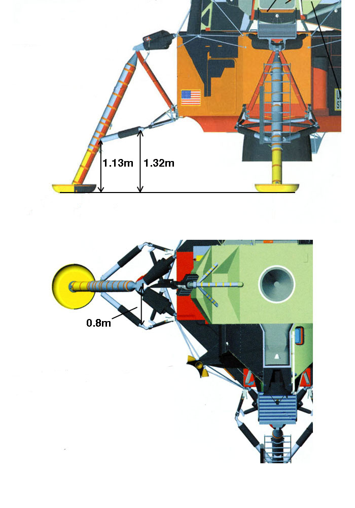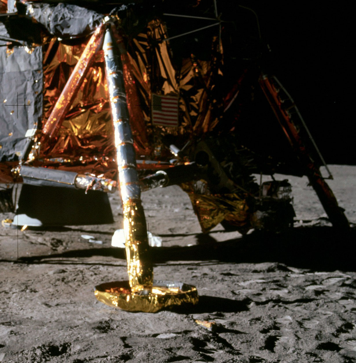 | Detail from AS11-39-5777, taken out Buzz's window before the EVA. See also, a detail from AS11-40-5857, a frame from Neil's ladder pan. |