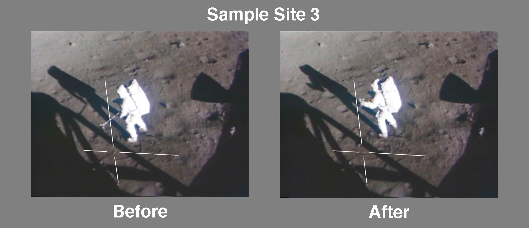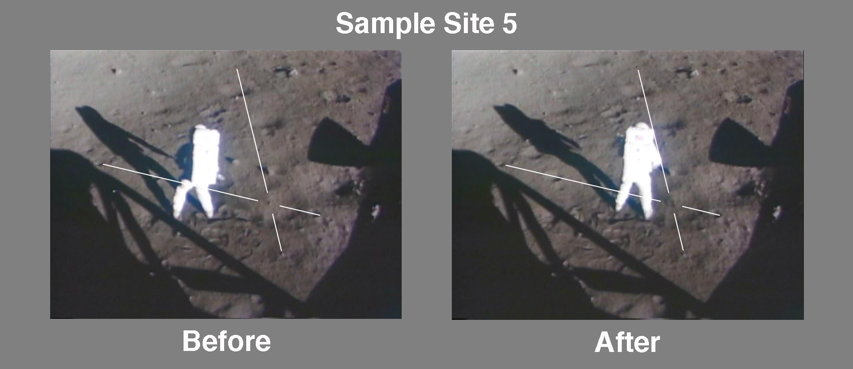 | "Before" and "after" images of Sample Site 1. The white lines, which connect distinctive features - rocks, shadows, etc. - visible in both images, indicate the original location of the Site 1 rock. The scoop mark in the "after" image represents primarily the final motion Neil made with the scoop at Site 1. The video clip (34 Mb) gives details of the multiple scoop motions he made at this location. Click on the image for a larger version. |