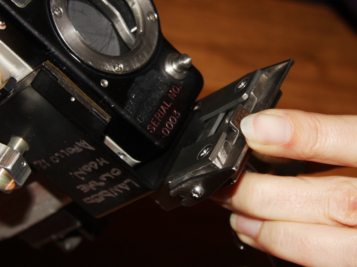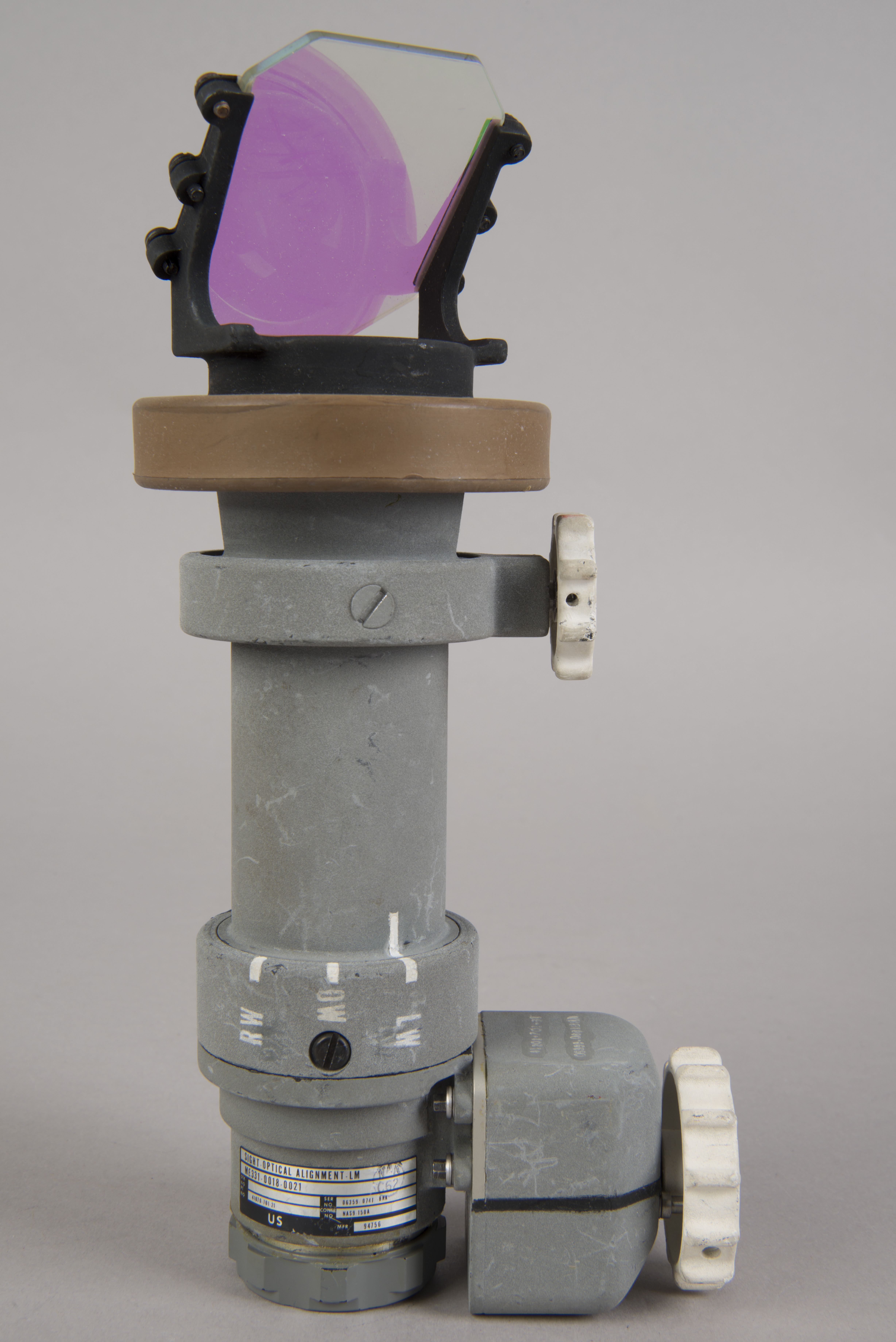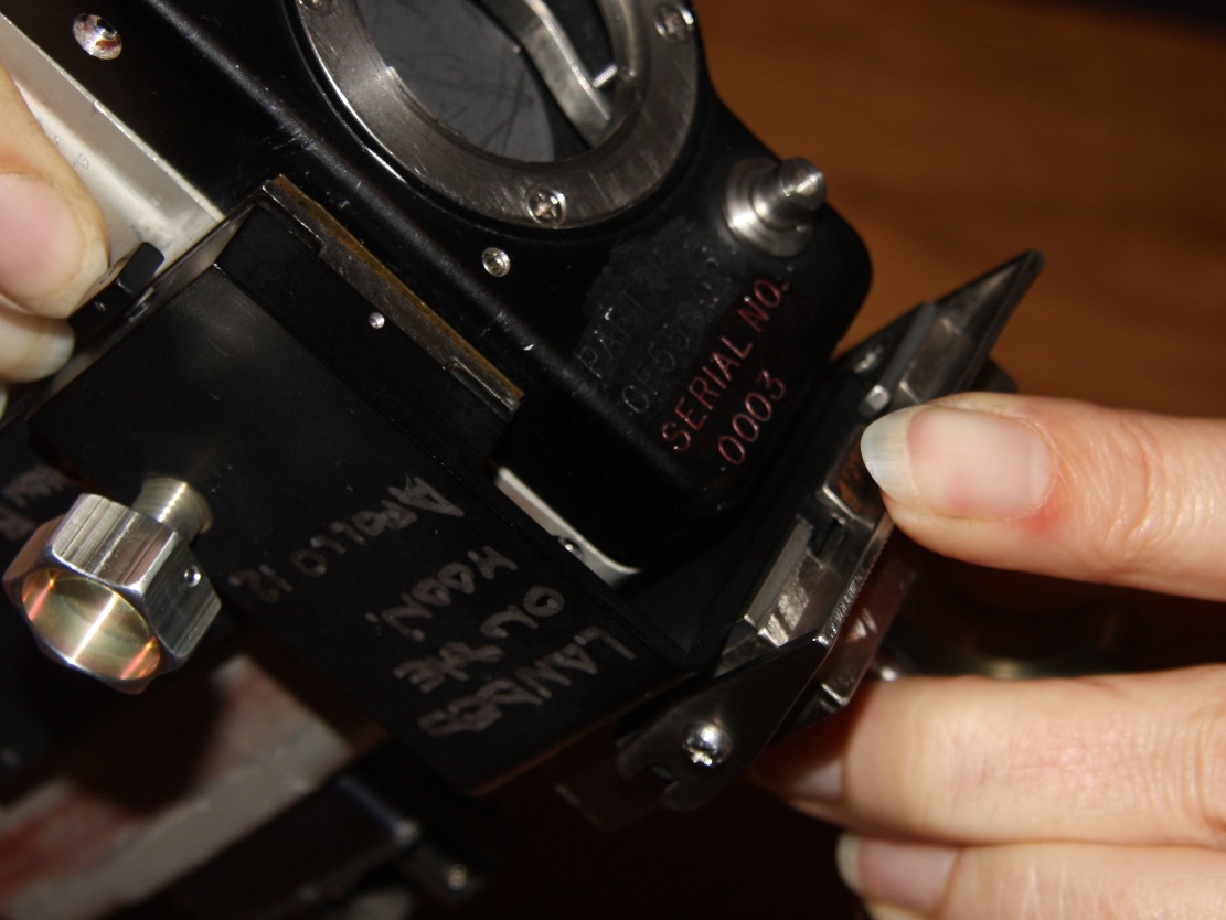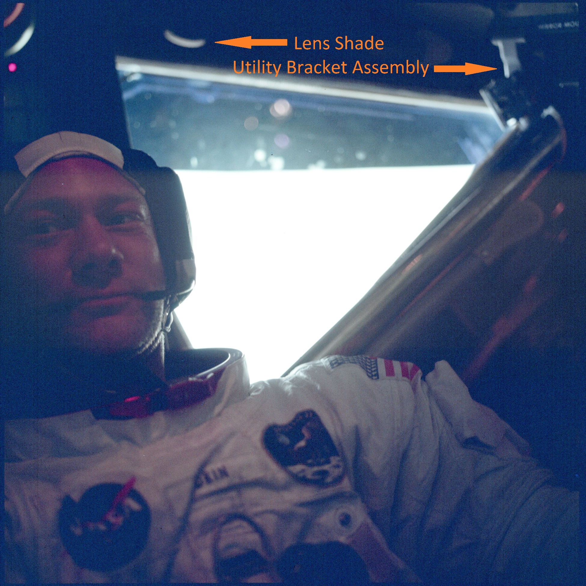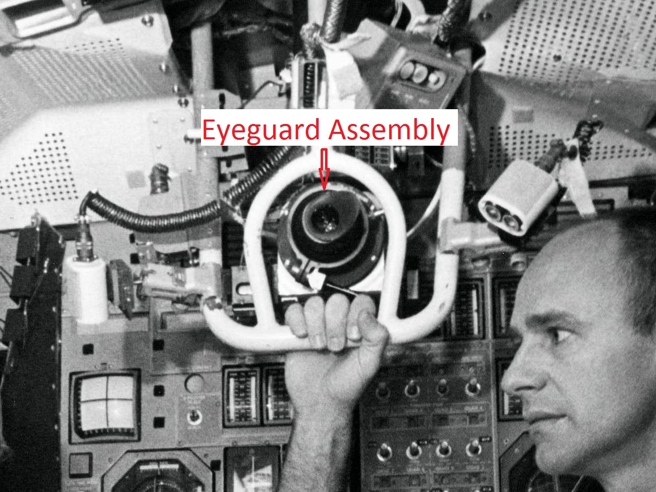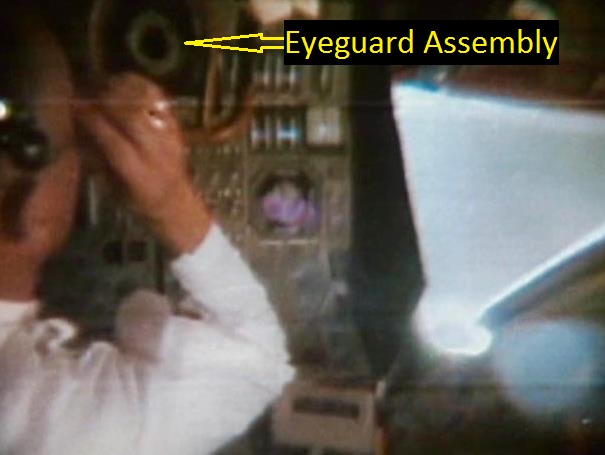 | The assembly consisted of a threaded base which screwed on to AOT barrel and a soft, rubber-like eyeguard. A detail from Apollo 12 training photograph 69-H-1679 shows a training unit in a LM simulator. A frame from the TV Neil shot during the initial LM inspection shows the assembly after Buzz attached it to the AOT. During the flight out from Earth, the Eyeguard Assembly was stowed in the RHSSC (Right-Hand-Side Stowage Compartment) next to Buzz's flight station. |