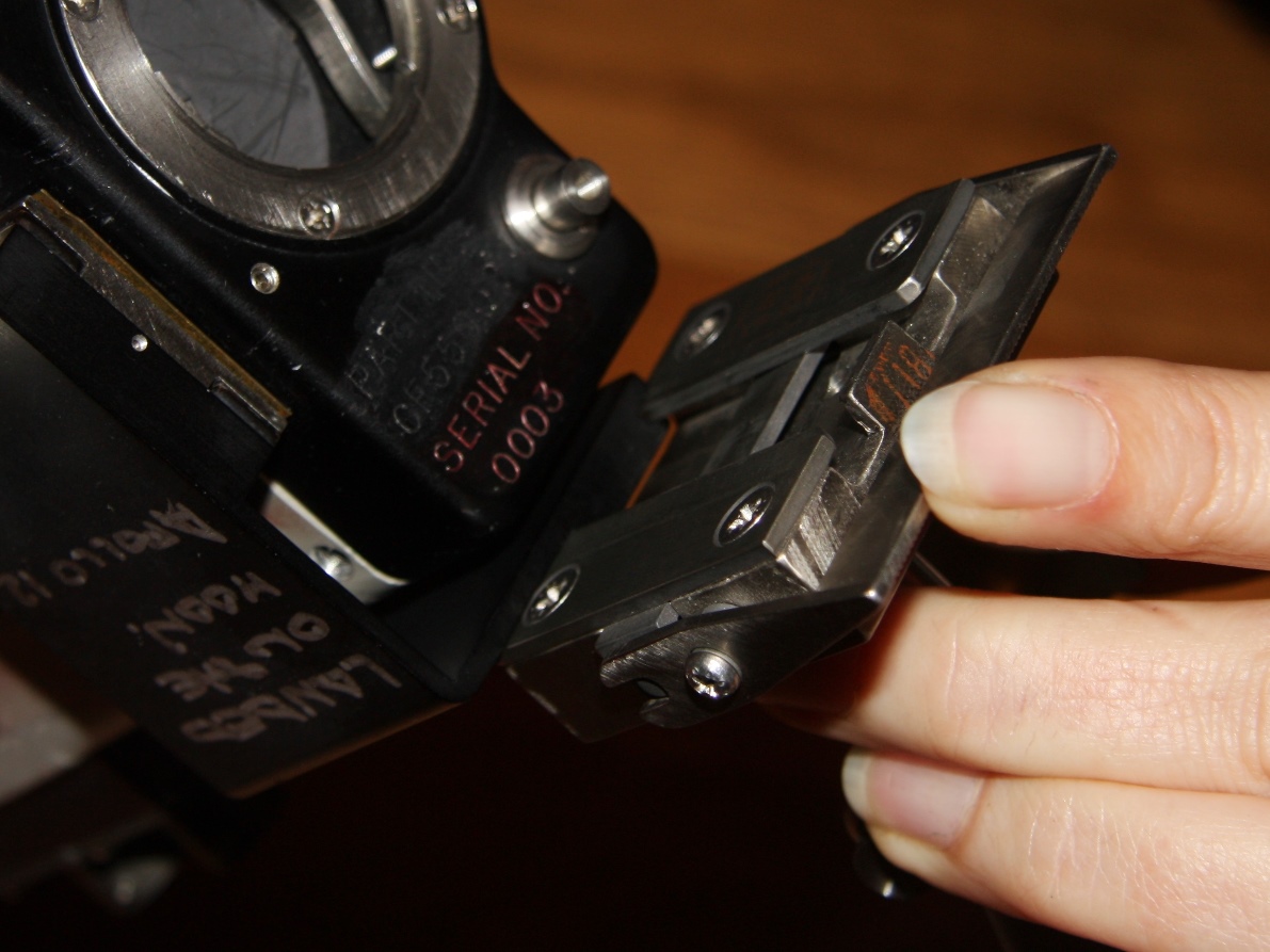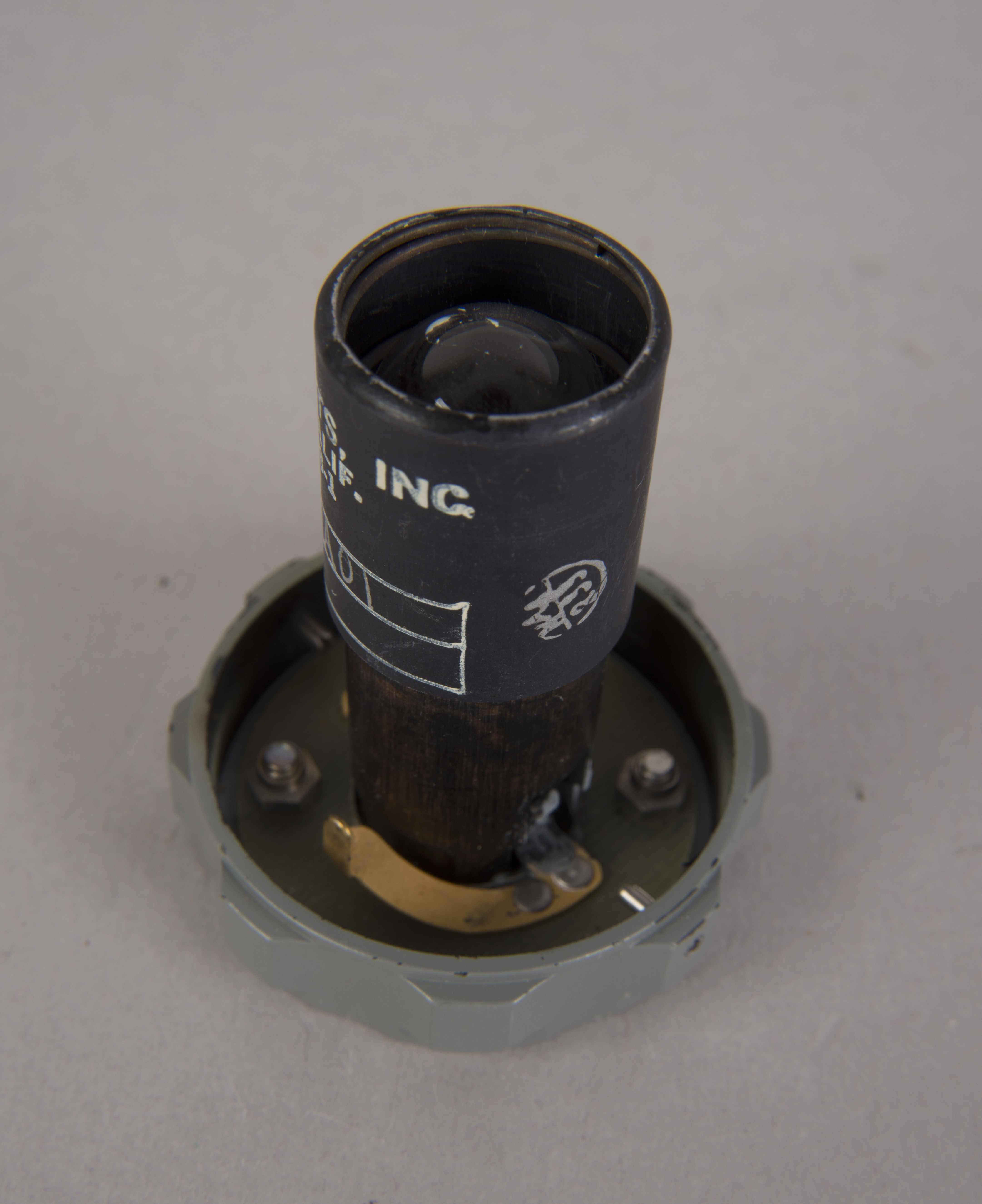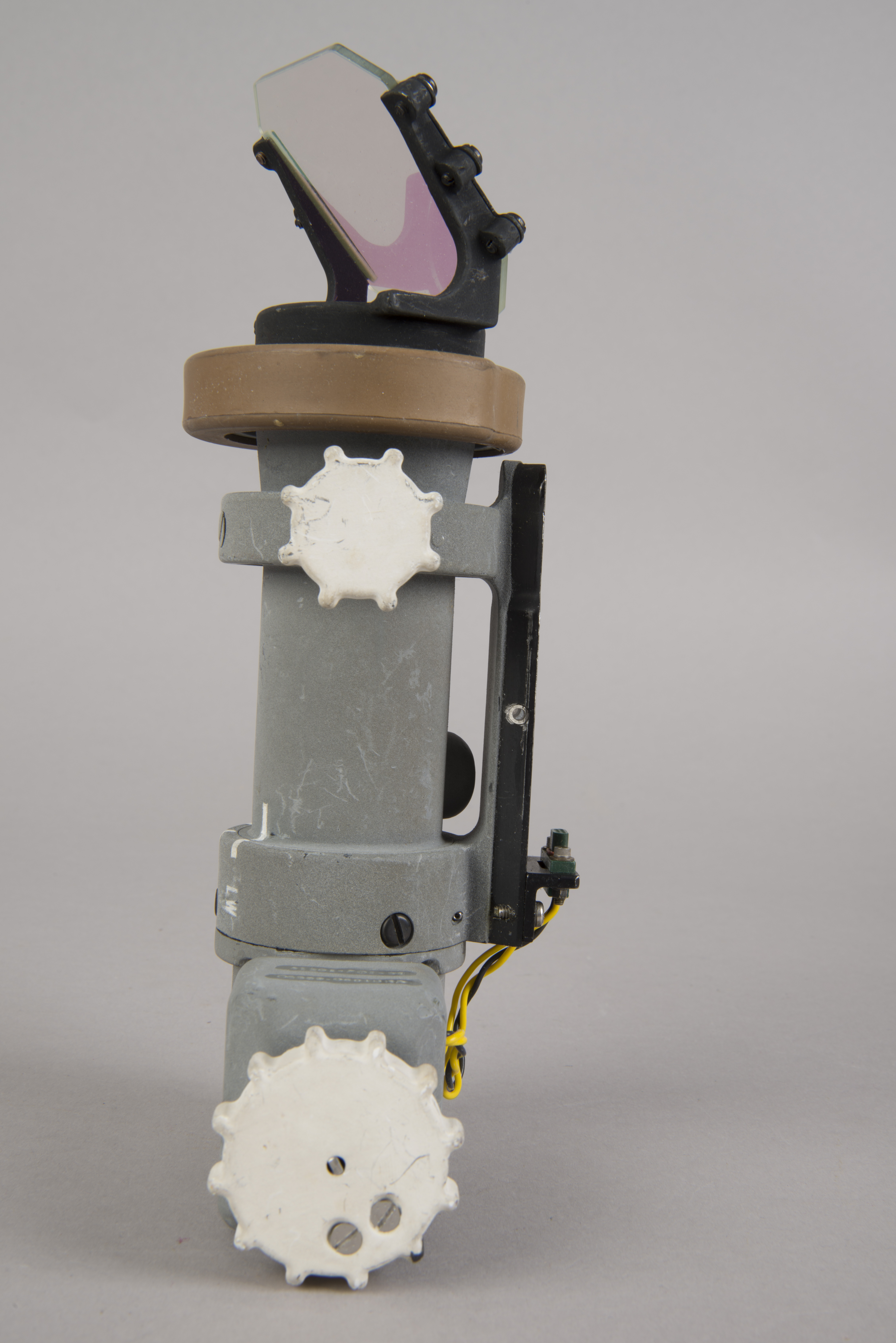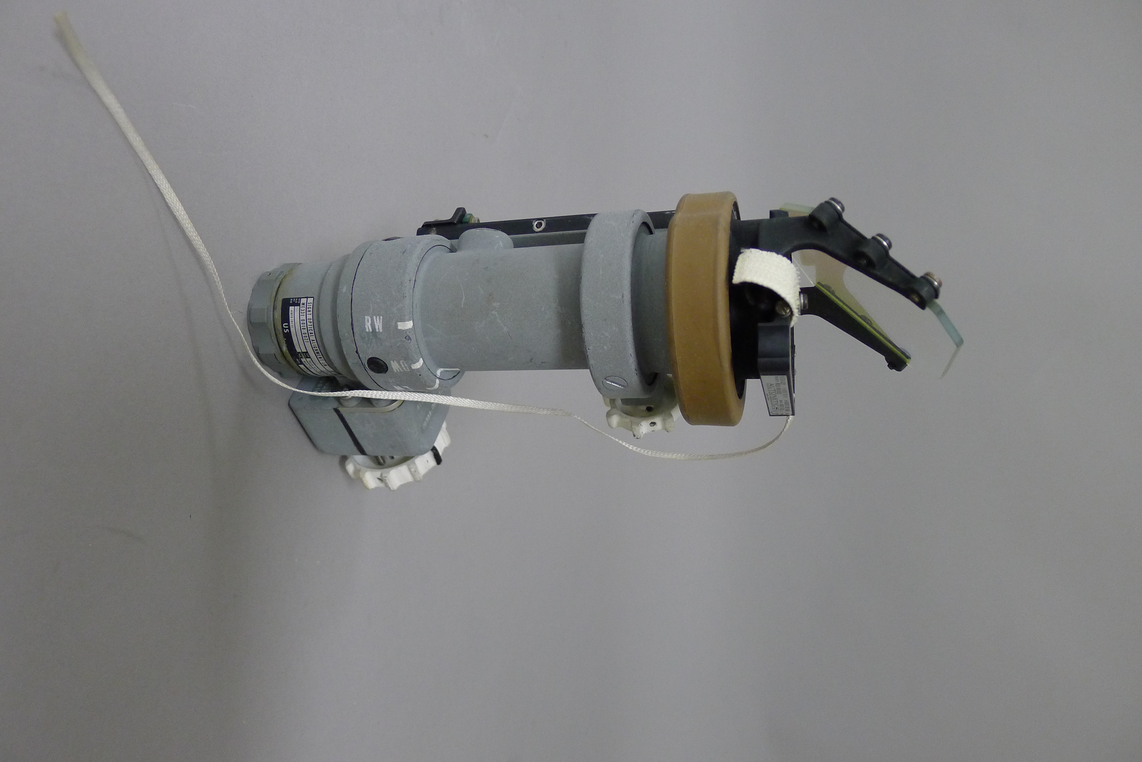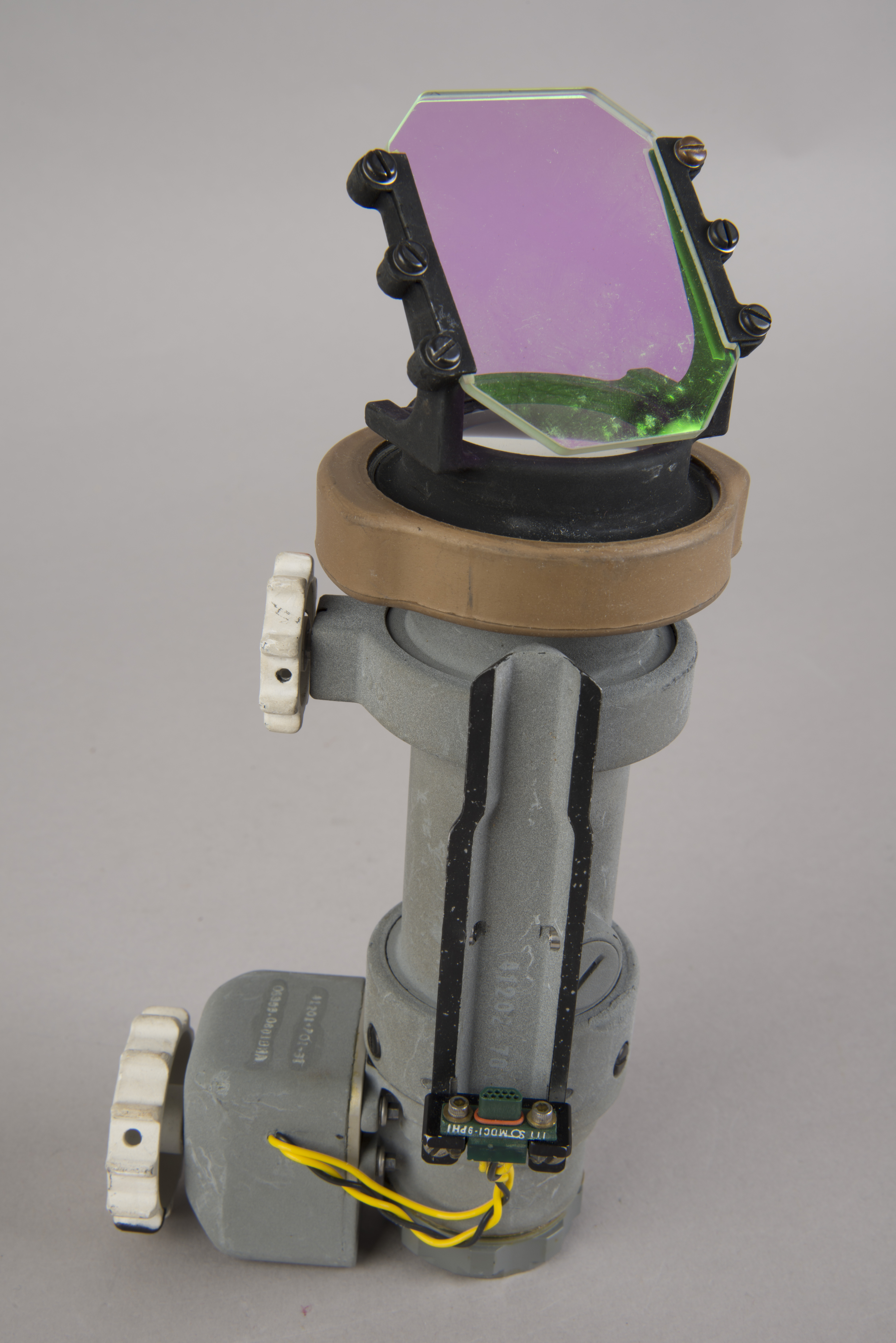 | The assembly consisted of a threaded base which screwed on to AOT barrel and a soft, rubber-like eyeguard. A detail from Apollo 12 training photograph 69-H-1679 shows a training unit in a LM simulator. A frame from the TV Neil shot during the initial LM inspection shows the assembly after Buzz attached it to the AOT. During the flight out from Earth, the Eyeguard Assembly was stowed in the RHSSC (Right-Hand-Side Stowage Compartment) next to Buzz's flight station. |