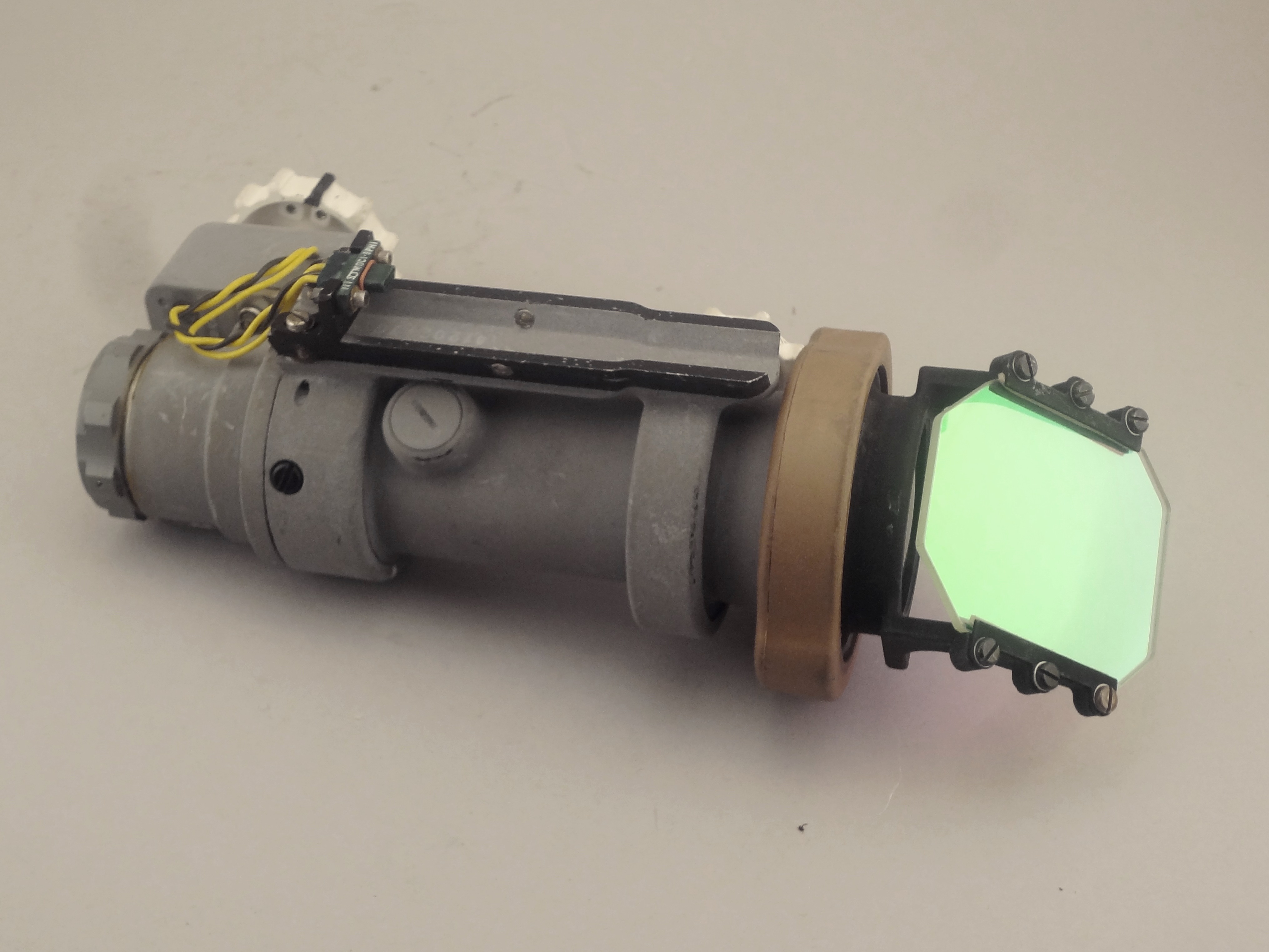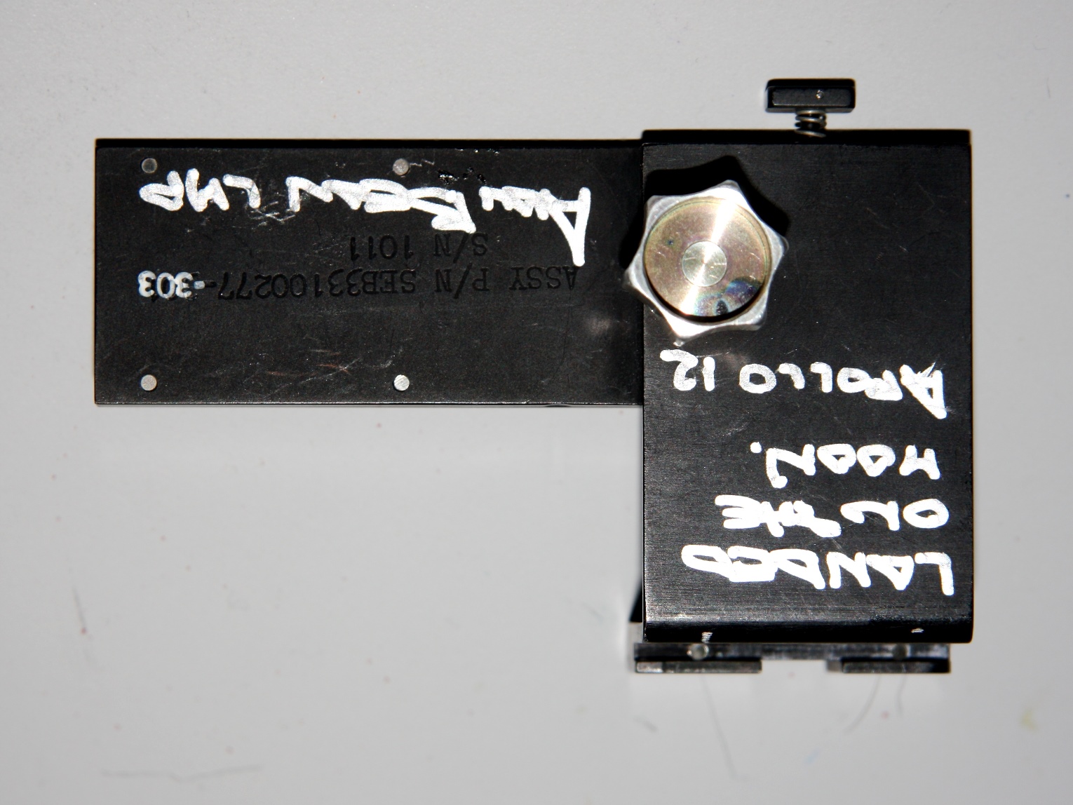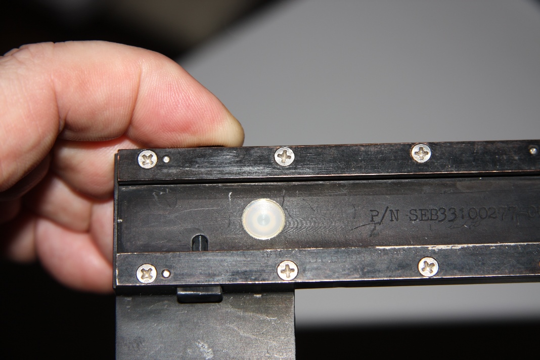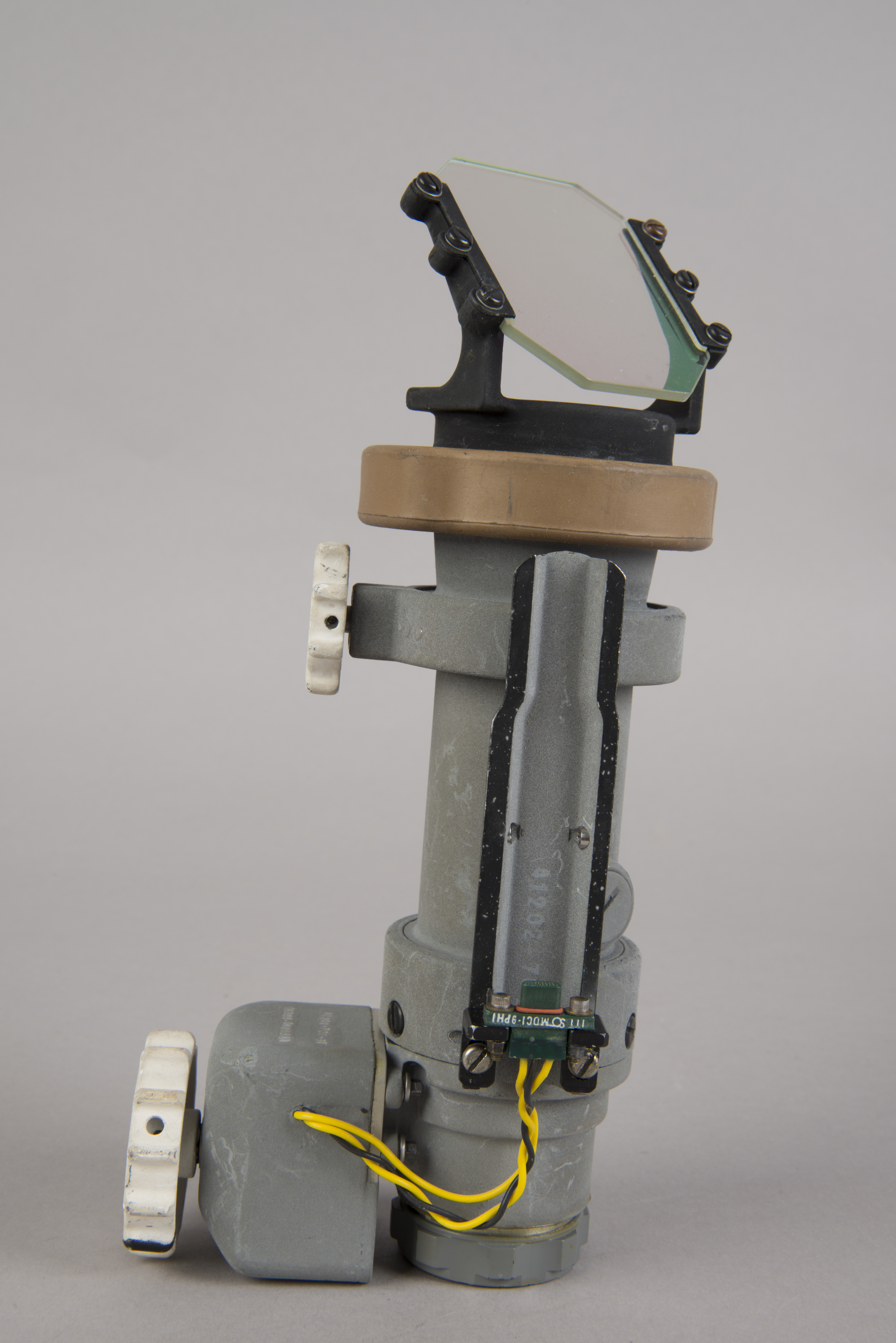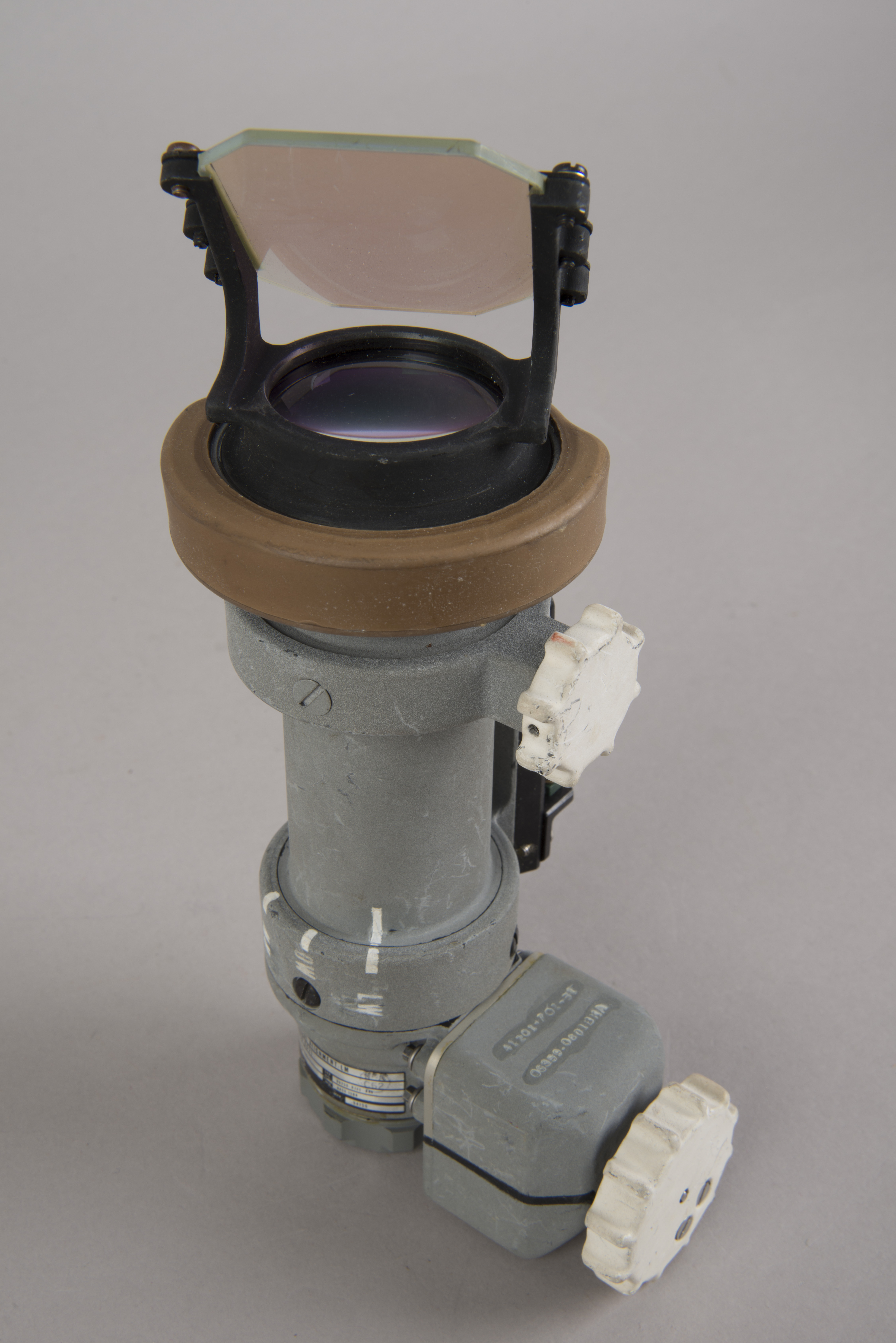 | The assembly consisted of a threaded base which screwed on to AOT barrel and a soft, rubber-like eyeguard. A detail from Apollo 12 training photograph 69-H-1679 shows a training unit in a LM simulator. A frame from the TV Neil shot during the initial LM inspection shows the assembly after Buzz attached it to the AOT. During the flight out from Earth, the Eyeguard Assembly was stowed in the RHSSC (Right-Hand-Side Stowage Compartment) next to Buzz's flight station. |