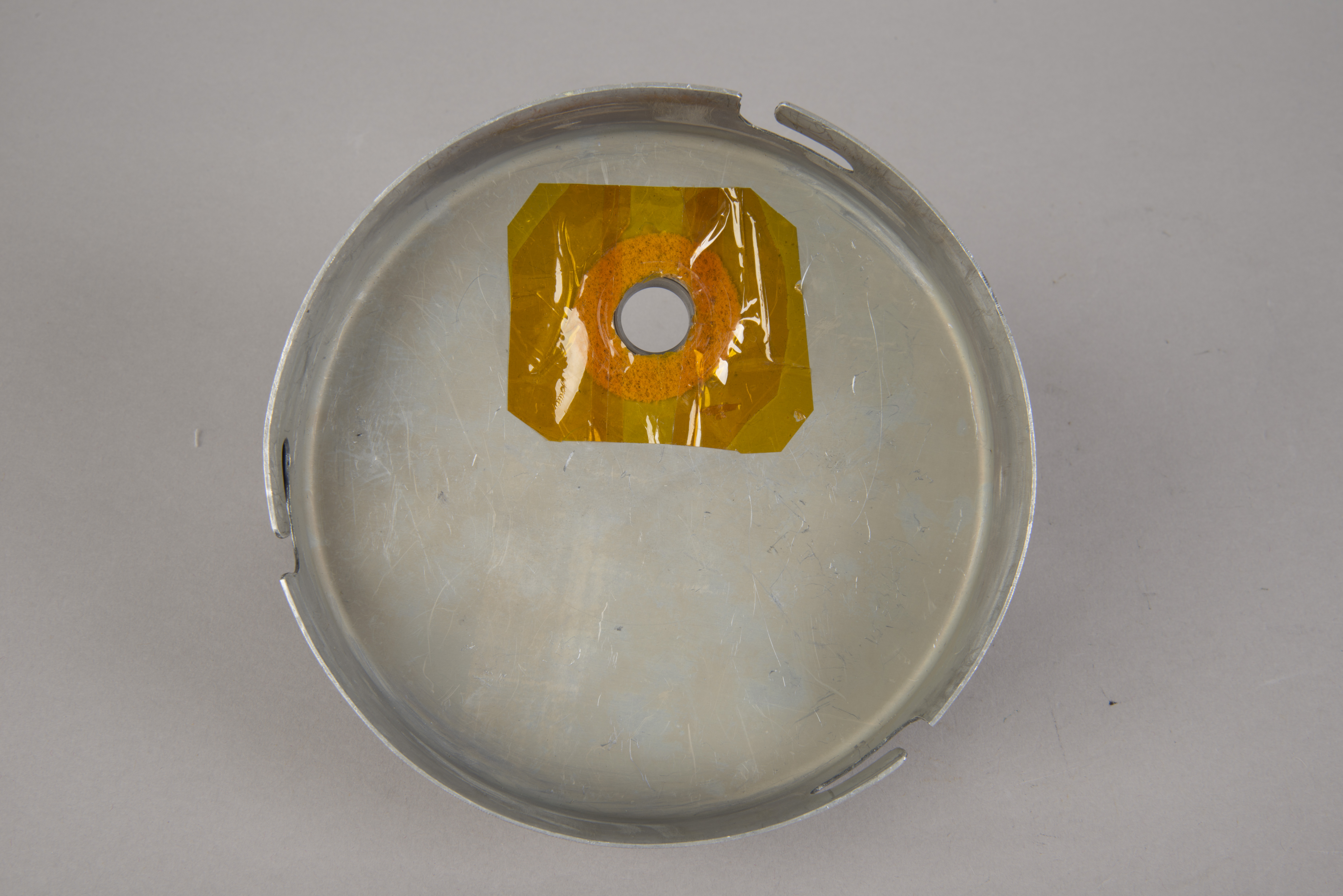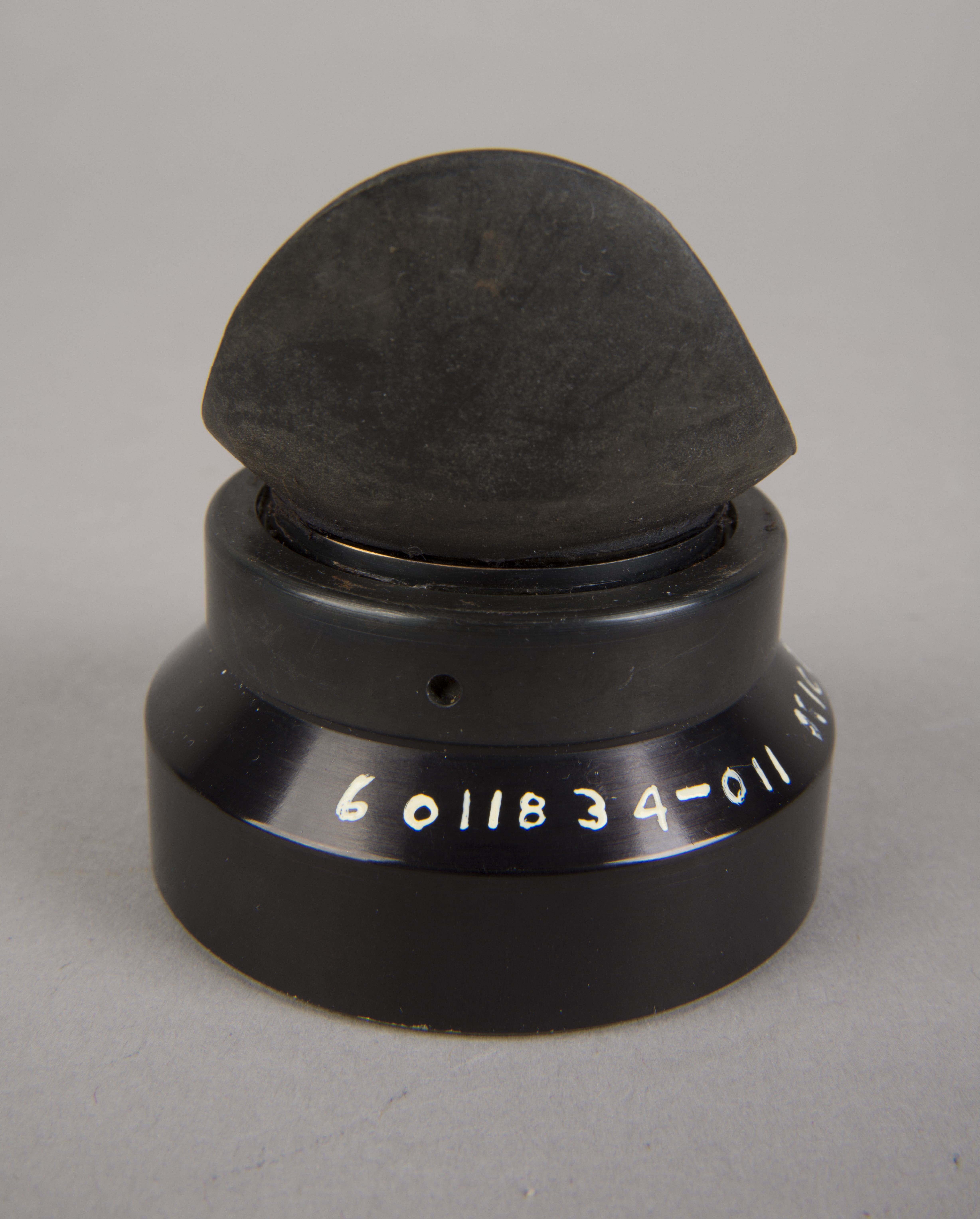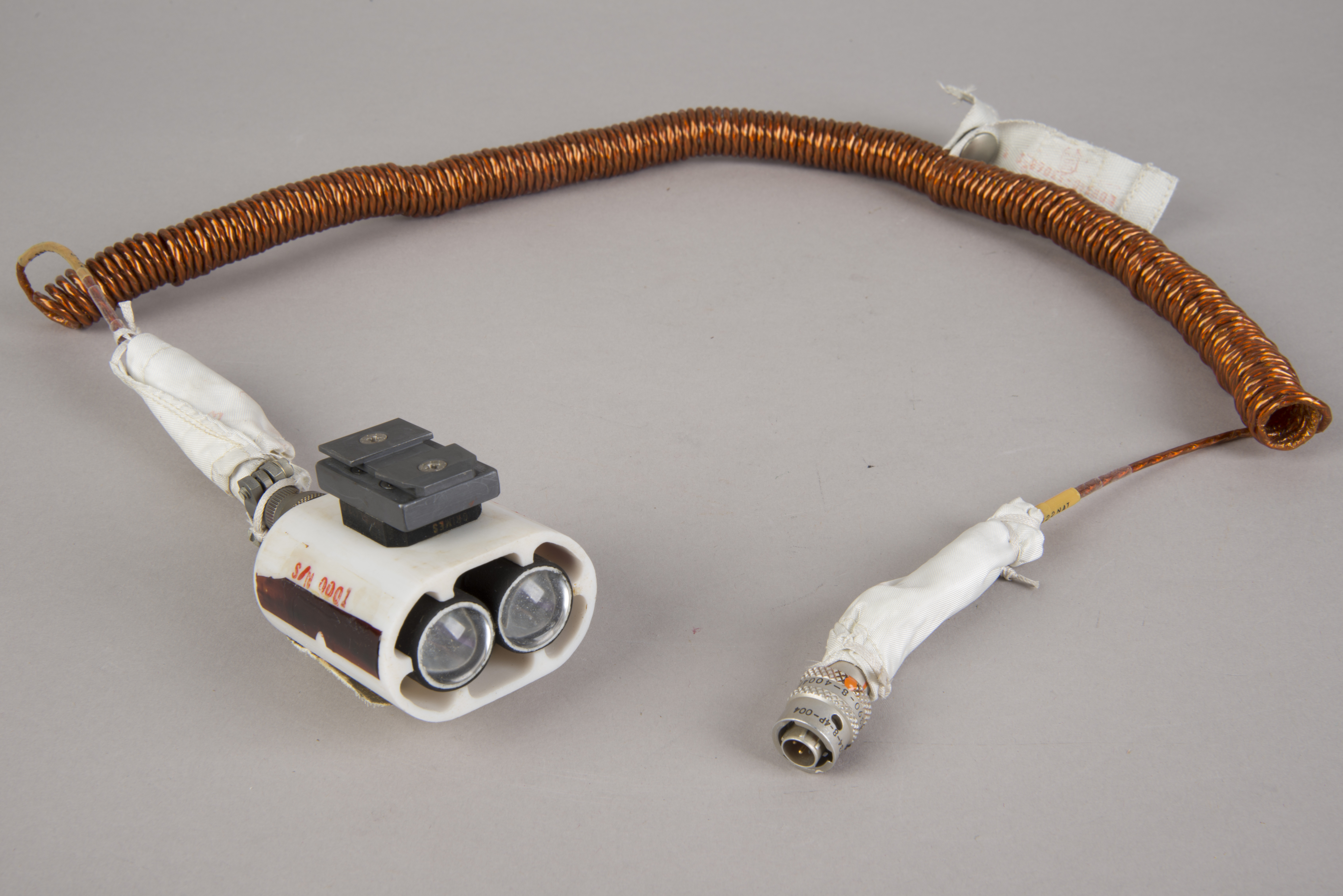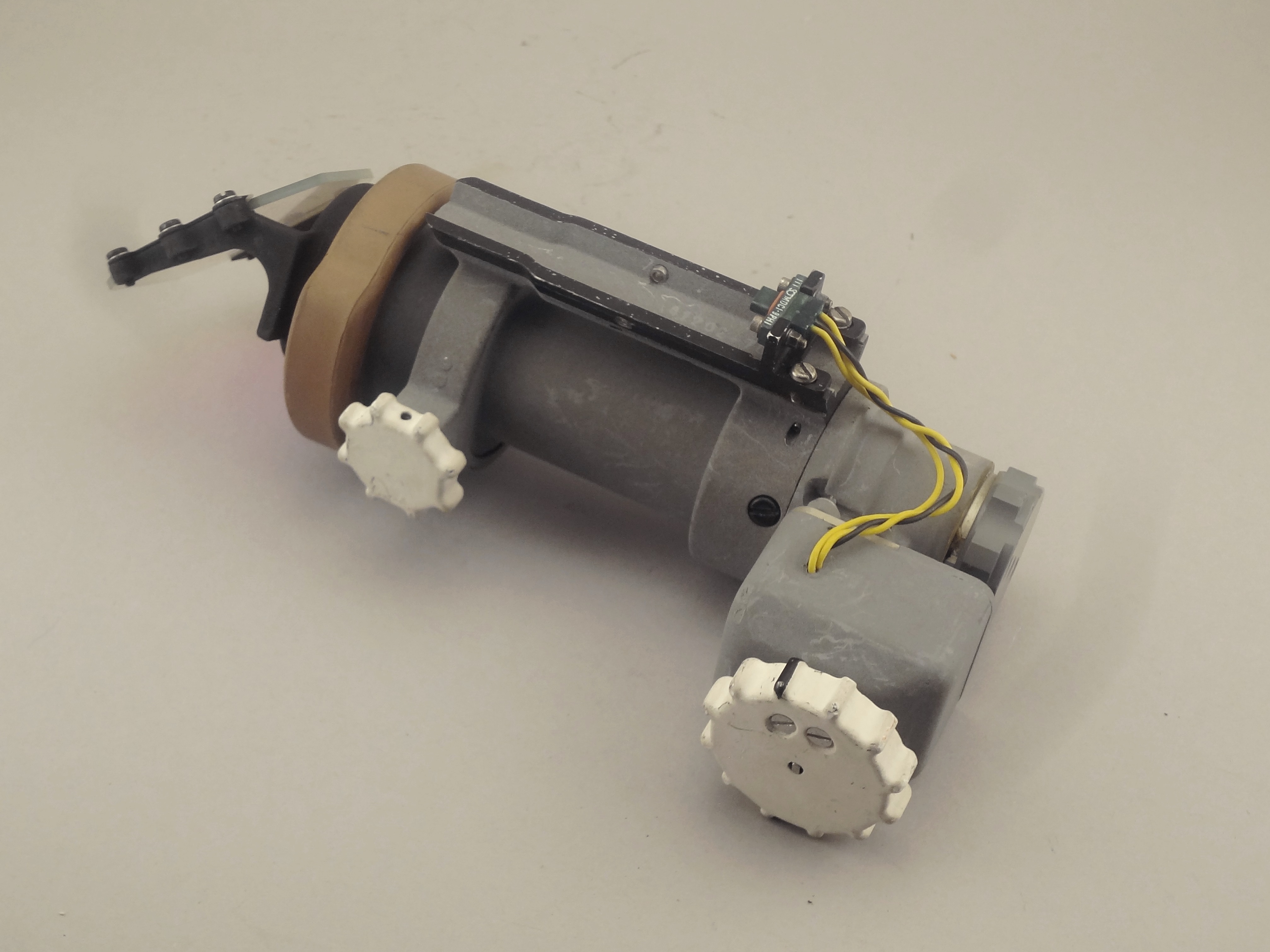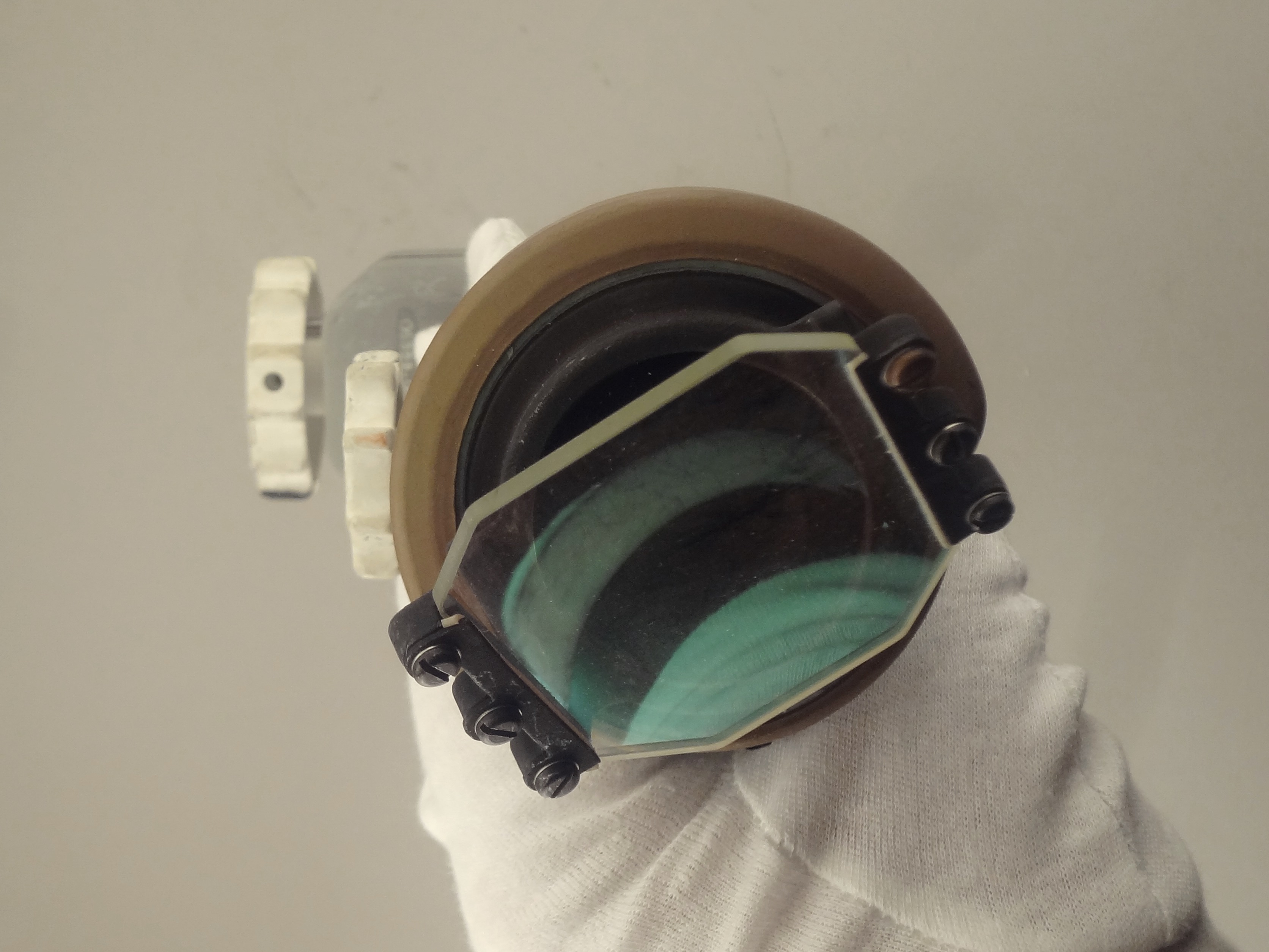 | The assembly consisted of a threaded base which screwed on to AOT barrel and a soft, rubber-like eyeguard. A detail from Apollo 12 training photograph 69-H-1679 shows a training unit in a LM simulator. A frame from the TV Neil shot during the initial LM inspection shows the assembly after Buzz attached it to the AOT. During the flight out from Earth, the Eyeguard Assembly was stowed in the RHSSC (Right-Hand-Side Stowage Compartment) next to Buzz's flight station. |