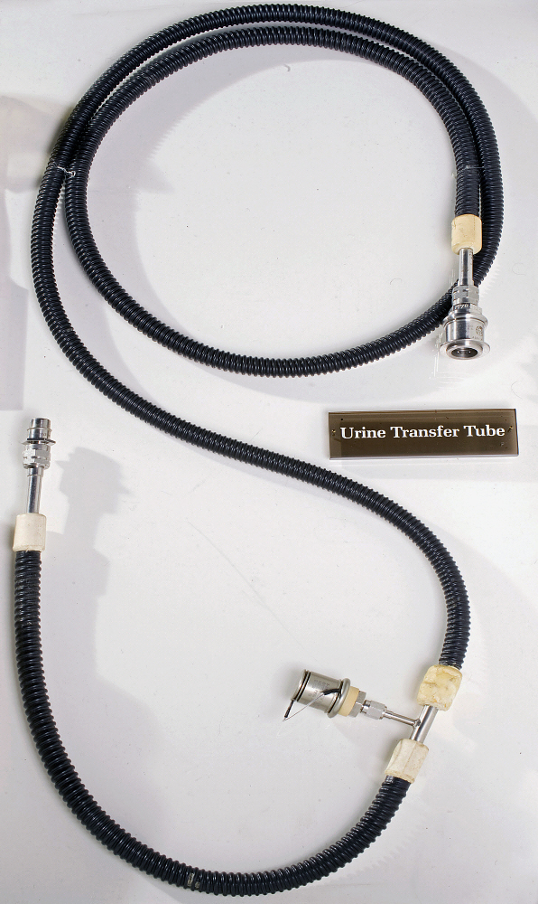 | TN D-6737, p12 (continued): "Difficulties with valve chatter in the pressure- sensitive part of the shutoff valve were encountered from the outset. This part of the valve was designed to prevent the crewmen from experiencing a vacuum or a reduced pressure on the inside of the UCTA. Although the valve action was much improved, hysteresis was never fully eliminated with the use of the pressure-sensitive part of the shutoff valve. An oxygen-bleed valve was added to the UCTA to provide a pressure-protection function, and the pressure-sensitive part was removed. The shutoff valve now functions properly. The one-bag urine-collection system was replaced on the Apollo 12 mission (LM-6) by six small 900-cubic-centimeter urine bags designed to connect directly to a PGA by means of a quick-disconnect fitting. Although the transfer valve, the large, 7-liter bag, and the drain lines were provided on the Apollo 11 mission (LM-5), the crewmen chose to use small urine-collection assemblies. The change to the use of six small bags was made to achieve lower weight and higher reliability. Although the small bags have been adequate for the initial LM missions, this design will not be adequate for 2- to 3-day lunar missions. Accordingly, the urine-collection system to be used on the Apollo 15 mission (LM-10) and on subsequent missions will incorporate a large vented tank in the descent stage, into which both urine and portable life support system (PLSS) condensate will be transferred. The use of a tank rather than many small bags provides a weight saving for extended missions. The LM urine-collection system has performed satisfactorily, with all bag sizes and quantities." The J-mission crews (Apollo 15, 16, and 17) removed their pressure suits so they could sleep more comfortably during post-EVA rest periods. Before they doffed the suits, they emptied the UCTA's into the descent stage tank. Once out of the suits, as needed they could urinate into a funnel connected to the tank. The funnel and associated hoses and fittings can be seen in a photo of a LM Simulator at the Cradle of Aviation of Museum. Some of the urine hoses can be seen in an Apollo 17 close-out photo. |