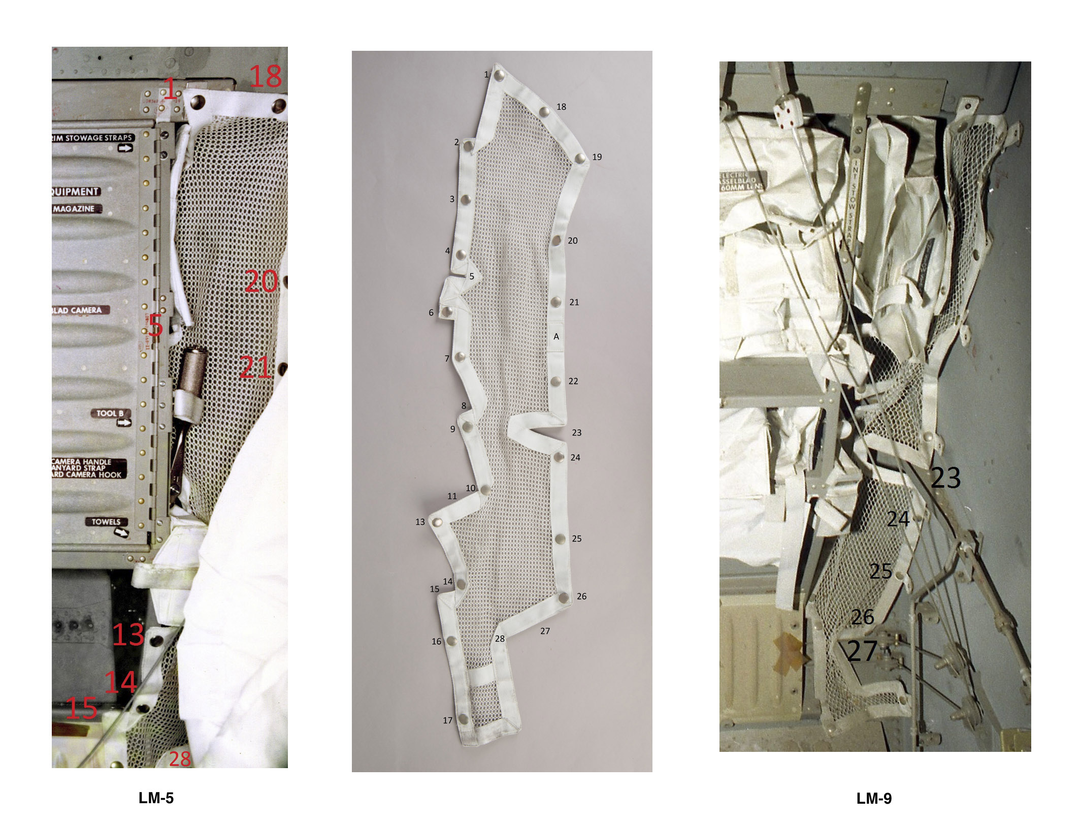 | Netting was placed in various locations in the LM cabin to protect pipes, conduits, and other gear on the rear walls from flying objects. Mission photo AS11-37-5528 shows an example behind Neil at the upper left. Other examples can be found in sets of pre-launch, close-out photos of the Apollo 12, 15, 16, and 17 cabins. (Click on the images for larger versions) |