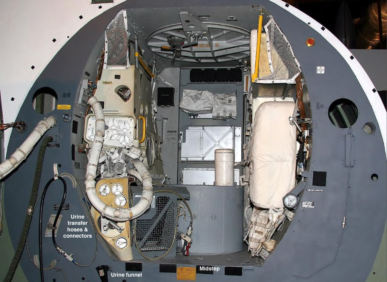 "Lunar module waste-management system. - To prevent contamination on the lunar surface, the LM waste-management system uses a pressure-operated urine-collection system. In accordance with the use of this system, a prime urine-transfer design constraint for the LM was that the crewmen would be protected at all times from pressure differentials. The system uses a direct dump, from the UCTA ( Urine Collection and Transfer Assembly) inside the suit, through the suit wall by way of a quick-disconnect fitting, and then to a pressure sensitive shutoff valve mounted on the +Z27 bulkhead behind the commander. The urine then passes through another short section of line to a 7-liter collapsible bag. The driving force for transfer of fluid is the inside-outside pressure differential of the PGA. Normally, the pressure differential would be present in a cabin-evacuated condition. However, it can be obtained by pressurizing the PGA from the LM ECS in a cabin-pressurized condition." As detailed in an extract from the Apollo Operations Handbook for LM-5 (Eagle), there were options for emptying the UCTA's which involved attaching a urine line from the suit to the opening immediately above the "OPEN" decal on the cover. An National Air and Space Museum photo of an Apollo 11 CM urine transfer tube may include fittings that were also on the LM version. |